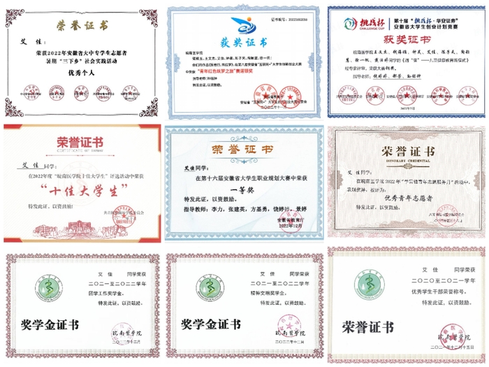 “日积月累见功勋,山穷水尽惜寸阴”。在校期间,艾佳先后获单项奖学金20余项,综合成绩名列年级前茅。她担任校学生会主席,为解决同学们的学习需求,带领同学们组织并开展“科创训练营”“最美笔记”评选等活动,切实做到全心全意为同学服务。同时,她将参加社会实践的收获进行总结升华,参加“互联网+”“挑战杯”等系列竞赛,获省级银奖一项、铜奖两项,校级银奖两项、二等奖一项,并在第十六届大学生职业生涯规划大赛中获省级一等奖。