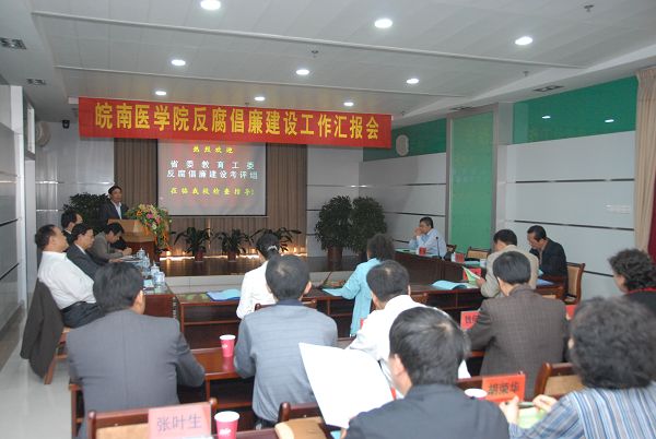 考评组组长杨家芹向与会人员介绍了考评组的组成人员和此行的主要任务、考评内容、方法、程序和考评重点。随后,校党委书记卞国忠就我校贯彻落实《关于加强高等学校反腐倡廉建设的意见》情况作了全面汇报。