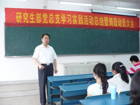 总支书记胡剑北作总支第一阶段活动总结发言,他指出,研究生部党总支较好的完成了第一阶段的学习实践任务,做到了规定动作不走样、自选动作有特色,希望大家再接再厉,继续保持高昂的热情,完成好第二阶段的学习实践任务。