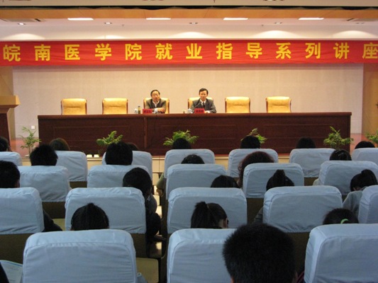 4月27日下午,在校领导的高度重视下,在学生处的诚挚邀请和精心组织下,泾县医院胡宝生院长来我校作题为“人生  事业  奉献”的就业指导讲座。讲座由校党委副书记郑勇超主持,我校2009届毕业生和各级在校生400余人聆听讲座。