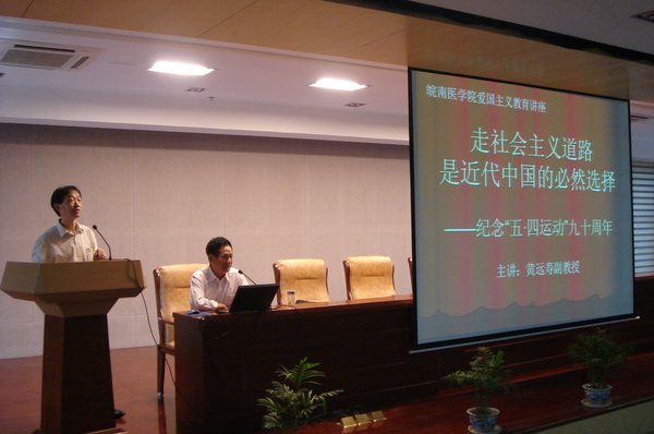 黄远寿副教授结合丰富的史实,生动的事例,深刻地阐明了只有社会主义才能救中国、只有中国特色的社会主义才能发展中国的道理。指出在纪念“五四运动”九十周年之际,坚持走社会主义道路,坚持学习实践科学发展观对当代中国的科学发展具有重要意义。会场气氛热烈,精彩的讲座不时引起台下听众的阵阵掌声。