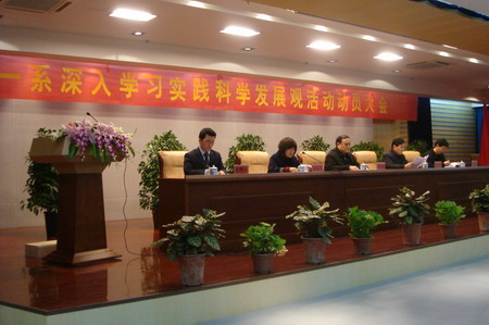 会上,系党总支书记杨新庆同志做动员报告。她首先阐明了开展深入学习实践科学发展观活动的重要意义和精神实质,强调要“学以致用,用以促学”。并对我系开展深入学习实践活动第一阶段实施方案做了周密部署。她表示我系将在校党委的坚强领导下,切实增强责任感和使命感,创造性地开展活动,扎实有力地做好第一阶段的学习调研活动。其次,她对全系党员,特别是学生党员提出了具体要求。指出全体党员要正确把握学习实践活动的部署要求,搞好统筹兼顾,认真学习研读活动材料,积极参加学习实践活动,解放思想,振奋精神,确保我系学习实践活动取得实效,为学校建设贡献自己的力量,做出新的成绩。