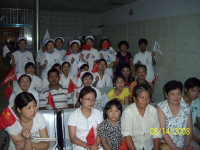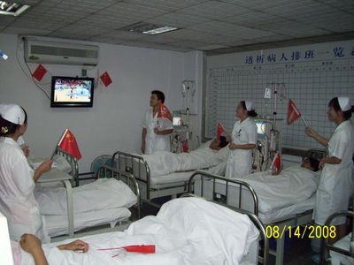 我校附属弋矶山医院护理系实习同学精心准备了小红旗和奥运五环旗,带领病人观看奥运会。