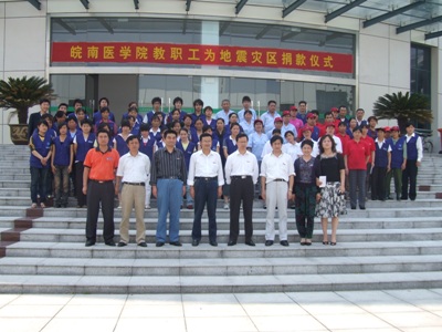 5月19日下午,芜湖市至诚服务有限责任公司全体职工在我校大学生活动中心举办了捐款仪式,我校党委副书记郑勇超,后勤处副处长张叶生、学生处处长钱何珍、副处长阮笑芳以及至诚服务有限责任公司总经理居平和至诚公司全体职工参加了捐款仪式,校党委副书记郑勇超同志作了重要的讲话,这次汶川发生的强烈地震,牵动了全国人民的心,各行各业以“送温暖、献爱心”的行动,支持灾区。此次至诚服务有限责任公司募捐活动充分表达了至诚对我校灾区学生的关爱。在这次募捐活动中,募捐合计25585元,其中至诚服务有限责任公司总经理居平捐助20000元,以表达对灾区人民的深情关怀。