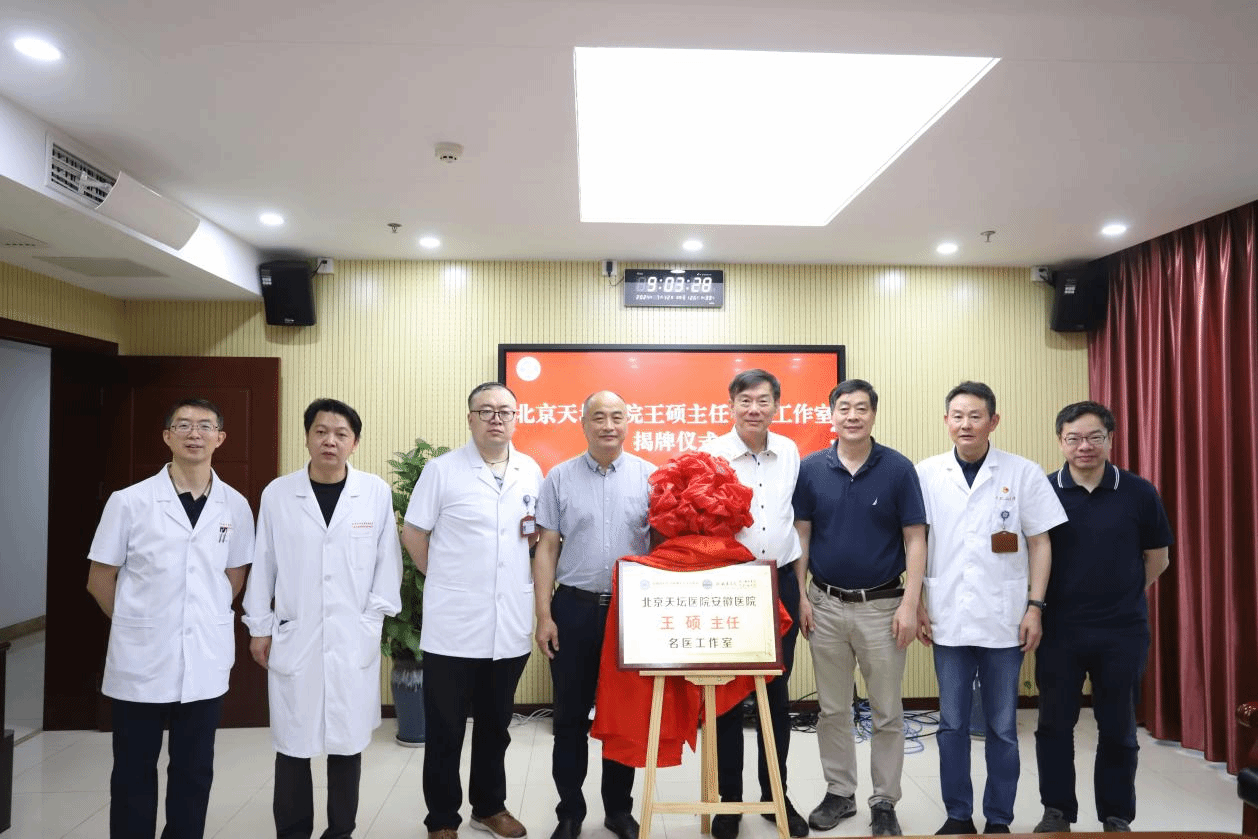 7月12日,首都医科大学附属北京天坛医院“王硕名医工作室”在我校第一附属医院揭牌。校党委常委、第一附属医院党委书记、北京天坛医院安徽医院党委书记陈晓宏,第一附属医院副院长、北京天坛医院安徽医院副院长江晓春,北京天坛医院安徽医院副院长王昊、许杰,北京天坛医院派驻专家王硕、王江飞、叶迅出席仪式,相关职能科室、临床科室负责人参加仪式。江晓春主持仪式。