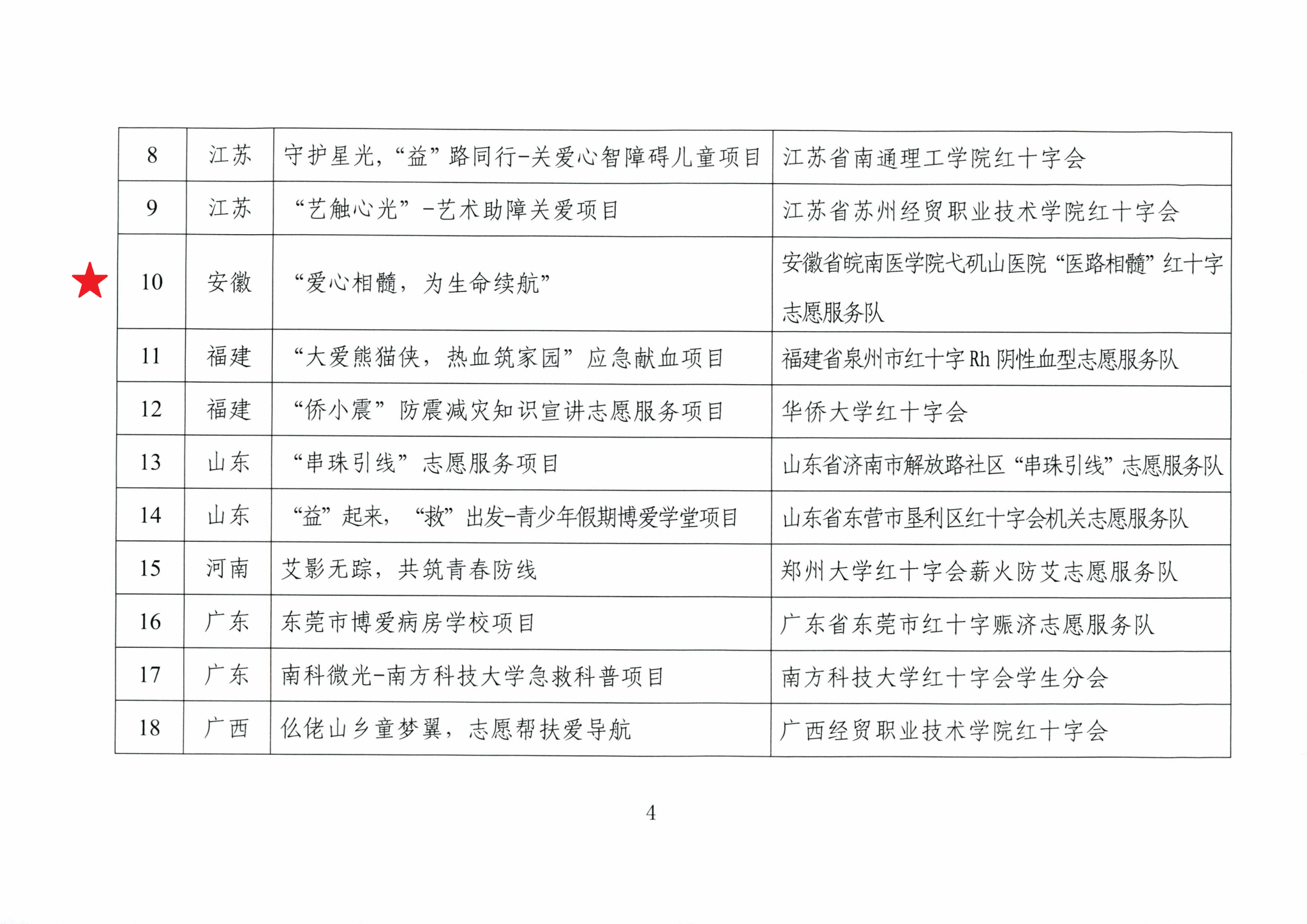 近日,中国红十字会总会第十四期红十字志愿服务项目发展计划立项名单公布,我校“爱心相髓,为生命续航”造血干细胞科普宣讲暨捐献志愿服务项目成功入选。此次红十字志愿服务项目发展计划以生命教育为主题,践行“保护人的生命和健康”的红十字会宗旨,弘扬“人道、博爱、奉献”的红十字精神,从全国各省级红十字会推选的志愿服务项目中遴选出25个项目加以支持,我校“爱心相髓,为生命续航”志愿服务项目为安徽省唯一入选项目,全国仅6所本科院校项目入选。