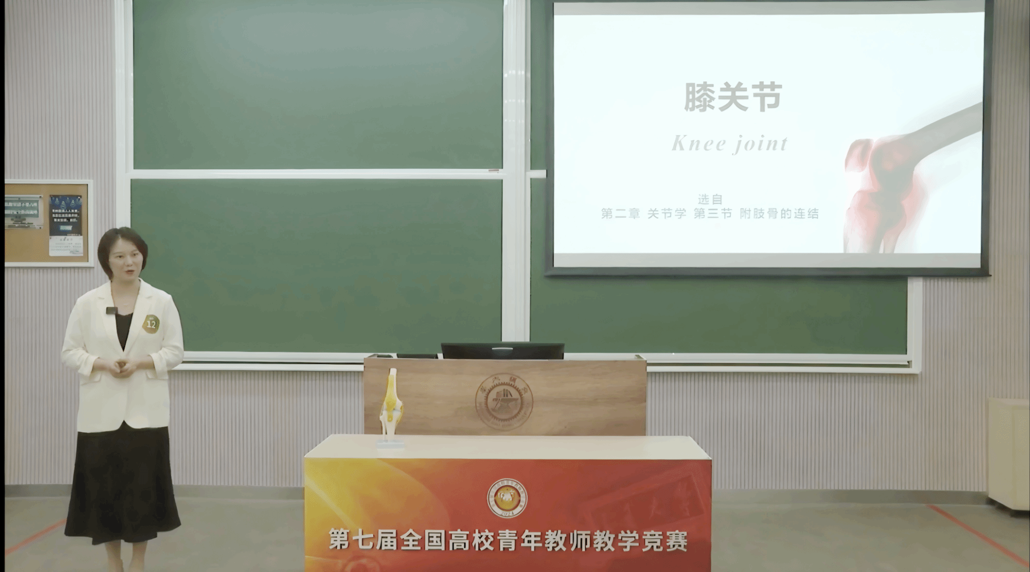 本届大赛设置文科、理科、工科、医科、思想政治课专项5个组别,竞赛内容由教学设计、课堂教学、教学反思三部分组成,决赛选手均为近3学年持续从事一线教学工作的高校青年教师。赛前每位参赛教师需提交一门课程16个学时的教学设计和教学课件,比赛前1小时现场随机抽取其中1个学时进行课堂教学展示和反思,最终综合三部分成绩得出总分。决赛现场,我校产翠翠老师参赛课程为《系统解剖学》,随机抽取的题目是“膝关节”。短短20分钟的现场授课,展示了安徽医学院校青年教师的智慧才华与青春风采,获得评委以及线上观摩直播网友的一致好评。