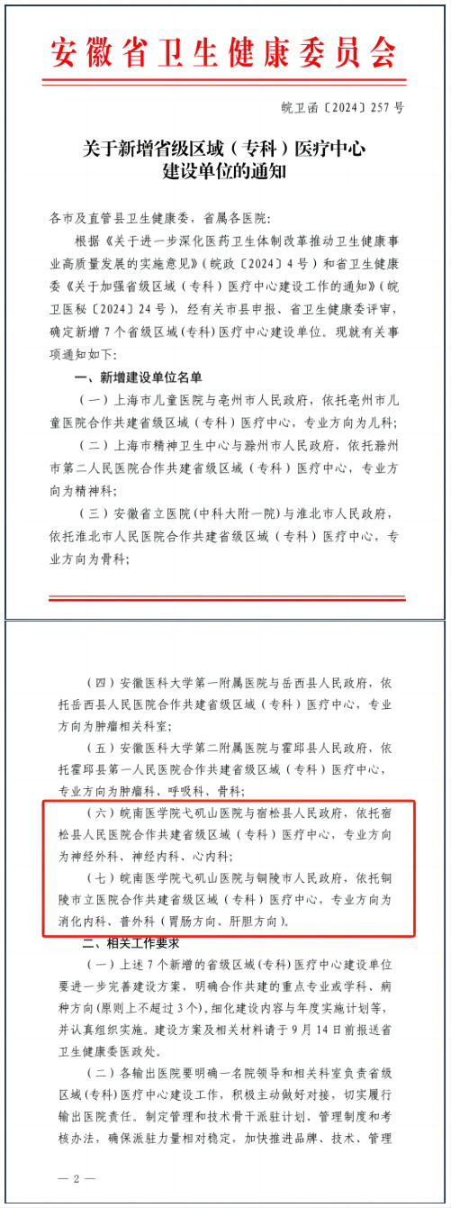 9月2日,安徽省卫生健康委下发《关于新增省级区域(专科)医疗中心建设单位的通知》,经组织申报、现场答辩、专家评审、挂网公示等环节,全省共有7个项目入选建设名单。其中由我校第一附属医院作为输出医院,与宿松县人民政府和铜陵市人民政府,分别依托宿松县人民医院和铜陵市立医院合作共建的省级区域(专科)医疗中心(心脑血管疾病)和省级区域(专科)医疗中心(消化系统疾病)2个项目获批立项。