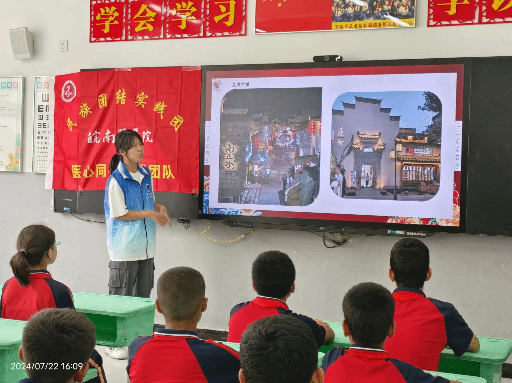 校团委“乡村振兴推普”、医学影像学院、临床医学院和口腔医学院的“石榴籽祖国行”等四支国家级专项团队分赴新疆和田、云南省文山壮族苗族自治州等地开展普通话推广、民族文化传承等实践活动,以“青春之声”促进民族交流,以“四海同音”助力乡村振兴。临床医学院“医心”、医学信息学院“苔花”、法医学院“溯往寻兴”等校级实践队先后前往宣纸文化园、凤阳县小岗村、安徽美术馆、芜湖市博物馆等地开展中华优秀传统文化调研,通过聆听历史、参观走访、工艺体验、匠心对话等方式感受非遗魅力,传承文化根脉。人文与管理学院“博谘•法润江淮”实践队发挥专业优势,深入各地书房、社区,通过情景案例和趣味抢答的形式开展反对校园霸凌普法宣传实践活动,为青少年健康成长保驾护航。“传薪于火,融往铸今”等12支校级实践队以校友走访的实践形式,聆听校友的故事,领悟背后的皖医精神。皖医青年在实践中坚定文化自信,争做中华文化的学习者、守护者、宣传者和践行者。