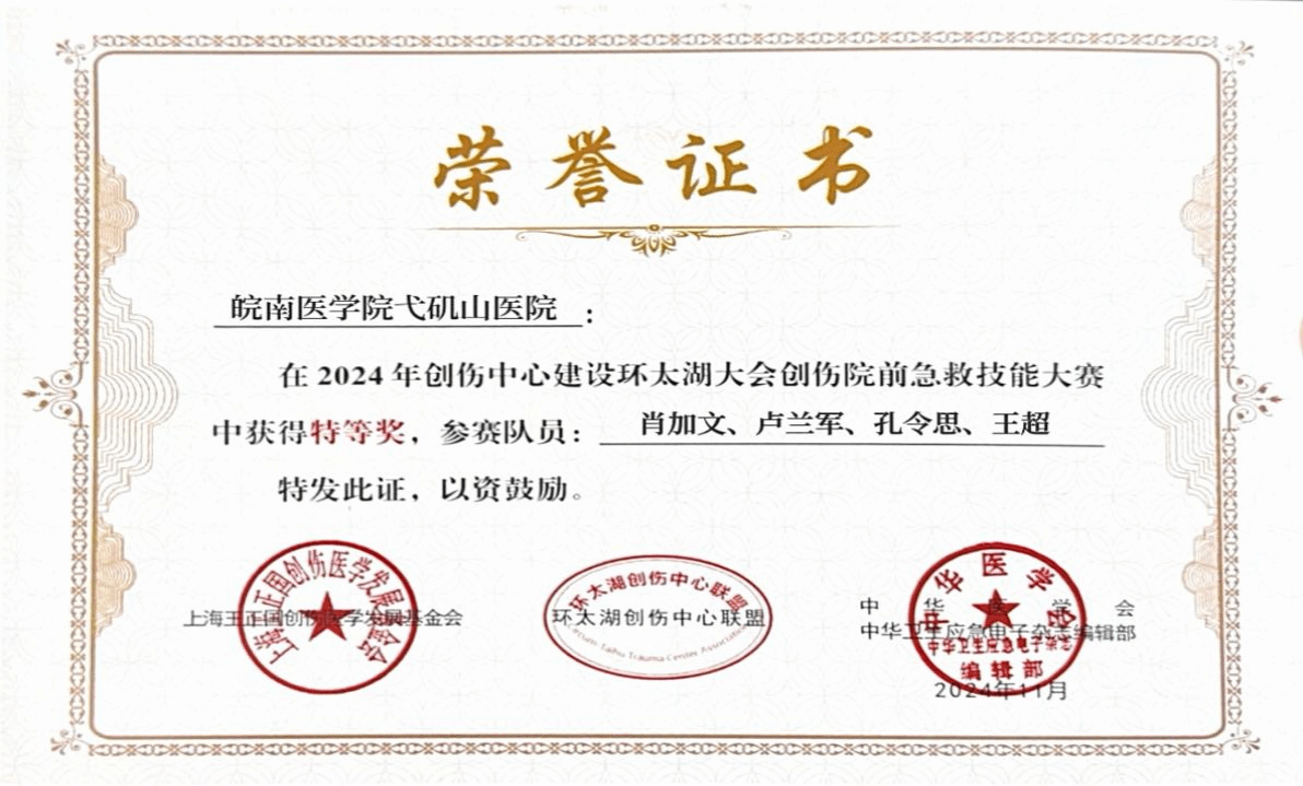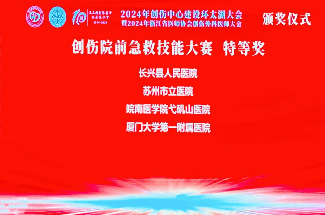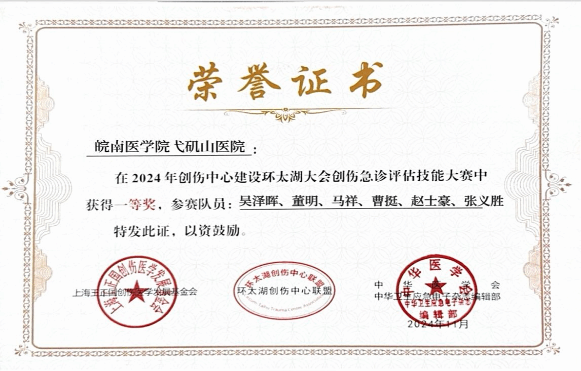 11月8日至9日,由浙苏皖闽四省医师协会联合举办的创伤中心建设环太湖大会在湖州举办,来自四省医疗机构的35个创伤院前急救团队和57个创伤院内急救团队参加技能大赛。我校第一附属医院急诊医学科团队在“创伤院前急救技能竞赛”和“创伤急诊评估技能大赛”中分别获“特等奖”和“一等奖”。