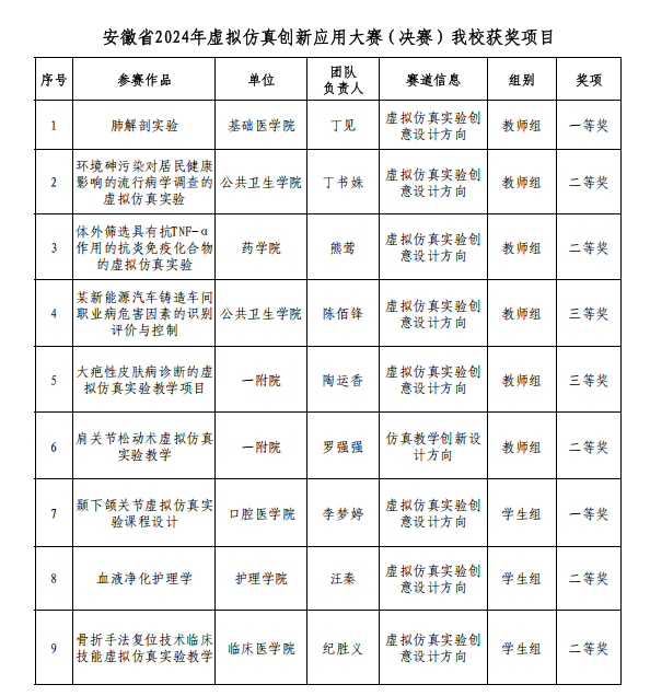 为进一步深化实验教学改革,加快推进虚拟仿真技术在实验教学的应用,促进多学科交叉融合,12月28日,由安徽省高等医学教育合作委员会主办、安徽医科大学承办的安徽省2024年虚拟仿真创新应用大赛在合肥举办,副院长文育锋带队参加比赛。经专家评审和现场答辩,我校师生凭借扎实的专业功底、创新的设计理念以及出色的现场发挥,从来自全省相关院校的35支参赛队伍中脱颖而出,获一等奖2项(其中教师组1项、学生组1项)、二等奖5项、三等奖2项。