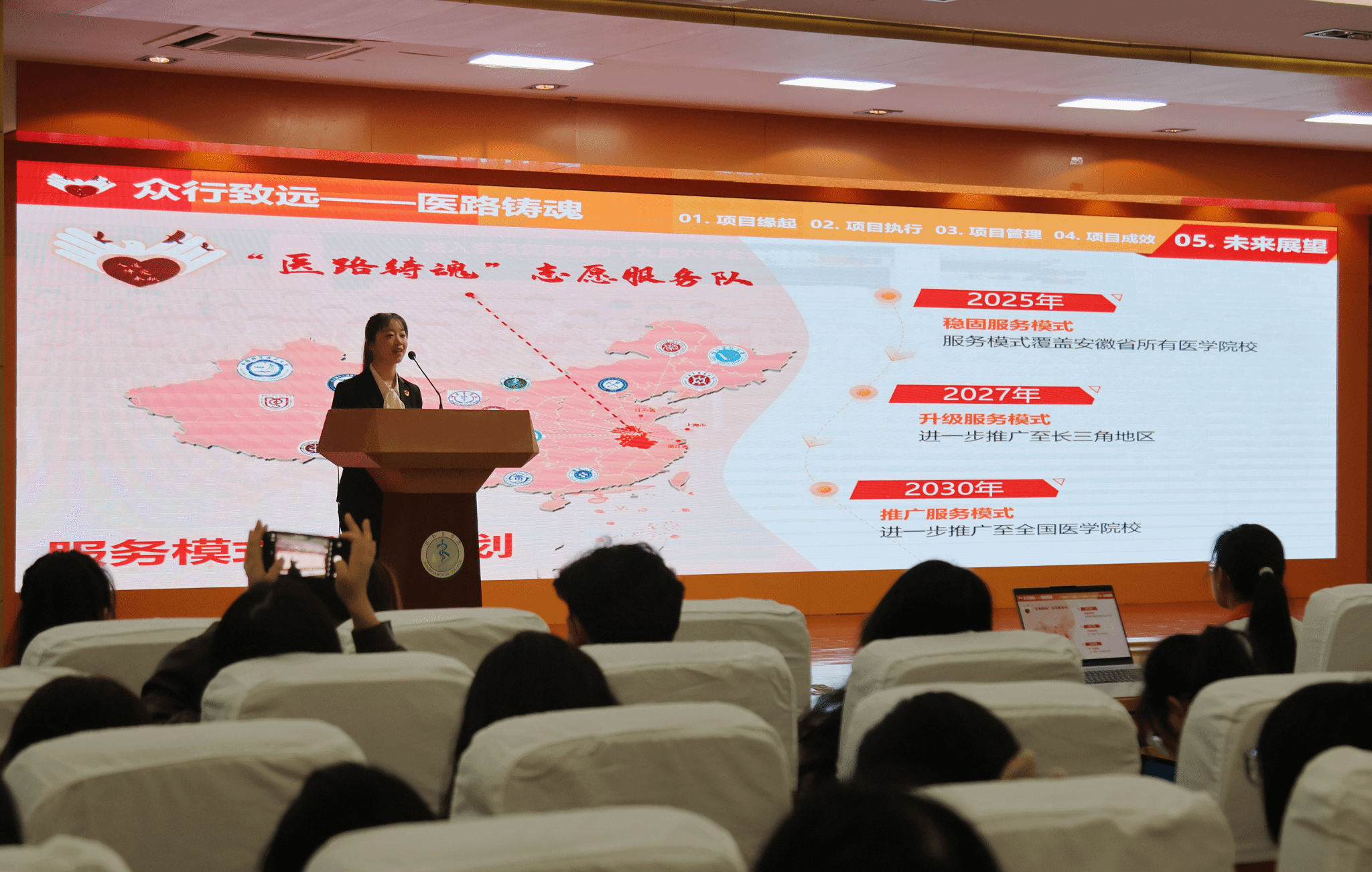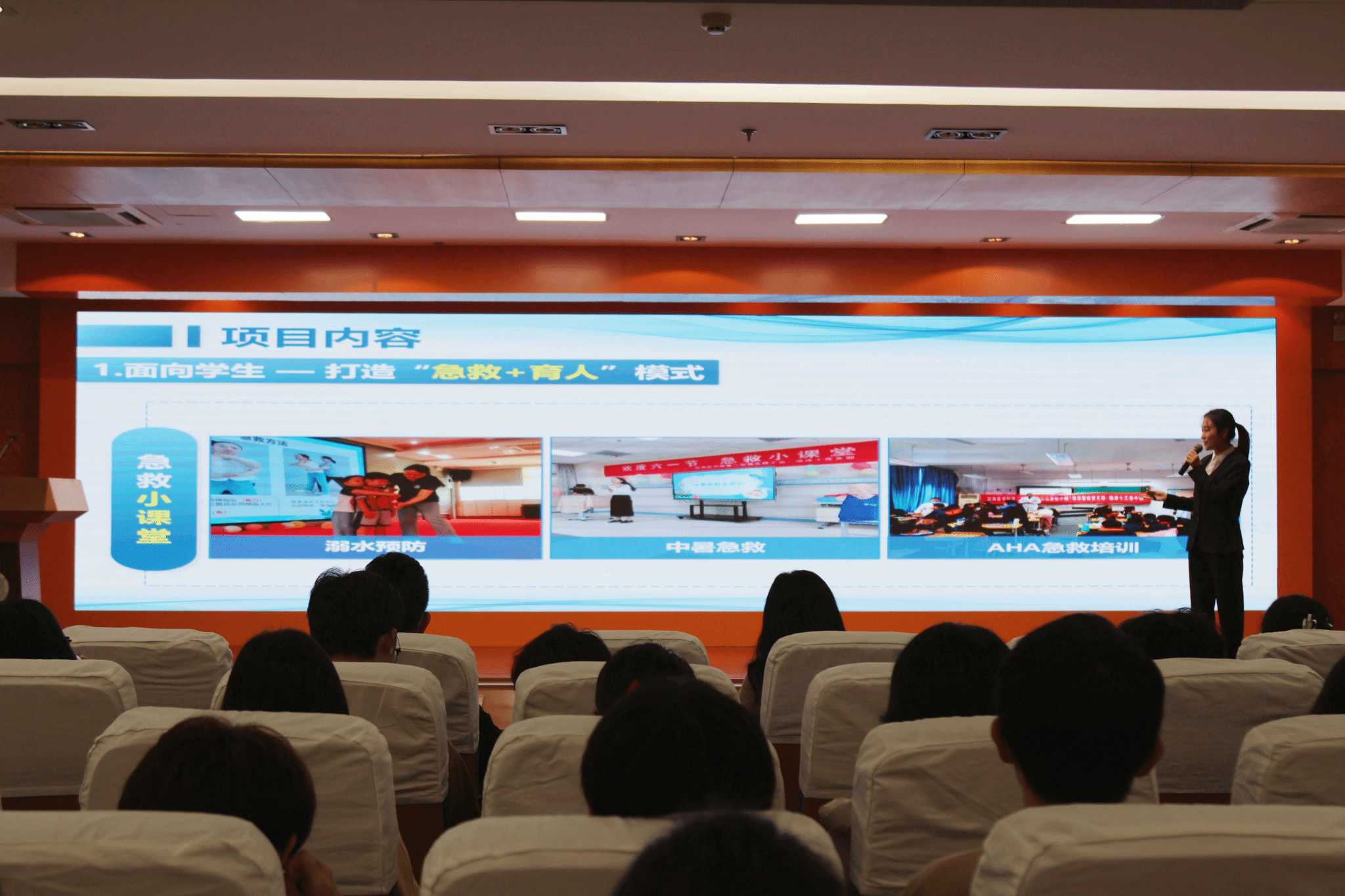 随后,来自第七届中国青年志愿服务项目大赛国赛金奖项目《遗路有爱——遗体捐献公益事业赋能行动》、国赛铜奖项目《鲁冰花开,童心筑梦——留守儿童心理健康关爱项目》以及省赛银奖项目《爱心相髓,为生命续航——造血干细胞科普宣讲暨捐献志愿服务项目》《“Woohoo急救”蓝丝带行动项目》等4个优秀项目的汇报人依次登台分享,从项目设计运维、团队建设、特色亮点、经验成效等方面进行交流展示,为我校青年志愿者进一步开展契合学科专业、彰显学校特色的志愿服务项目提供了可复制、可持续、可推广的经验和做法。