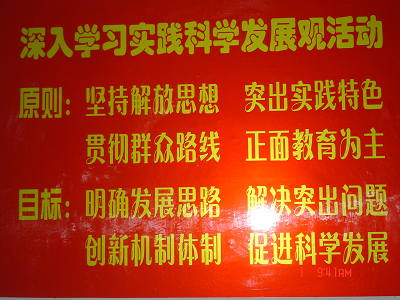 我们利用大学生活动中心的走廊和团委会议室,精心布置了深入学习实践科学发展观主题宣传栏。宣传栏以“科学发展观的内涵”、“三个代表思想的科学内涵”、“社会主义核心价值体系”及“胡锦涛在同团中央新一届领导成员和团十六大部分代表座谈时的讲话”等为主要内容。在进一步营造学习实践科学发展观校内氛围的同时,帮助我校广大团员青年更加直观、准确的理解党中央对当代青年大学生的思想政治和理想信念要求,拓展了我校思想政治教育的阵地。