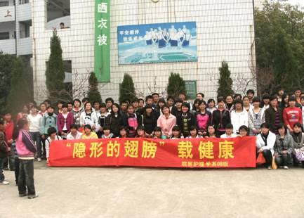 为积极响应校团委提倡的“青年志愿者服务月”活动,319日下午,护理学系2008级开展了以宣传健康知识为主题的“‘隐形的翅膀’载健康”活动。