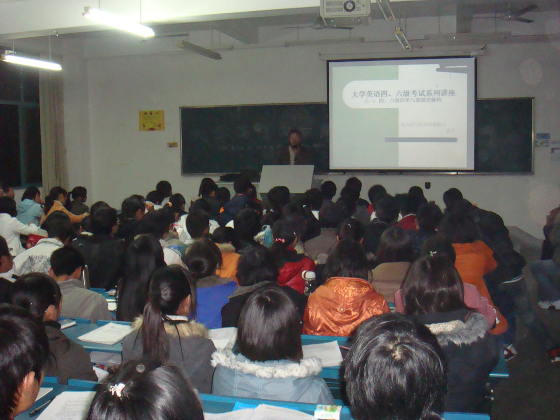 讲座原定晚7点开始,但5点前教室内已座无虚席,来参加讲座的有各系各年级的学生。650分,赵军老师以Franklin D. Roosevelt 的名言“The only thing we have to fear is fear itself ”拉开了讲座的序幕。他从四六级沿革和未来发展趋势、06年改革后四六级新题型的解析、如何备考等几个方面展开了对四六级考试的诠释。赵军老师深入浅出且不失幽默的讲座博得学生的阵阵掌声和笑声,显示出他对四六级考试深入的研究和独到的见解。
