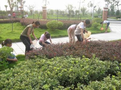 为迎接周末即将到来的新同学,以崭新的校园风光喜迎四方来宾,9月4日上午,护理学系2007级的同学不顾昨日搬家的辛劳与疲惫,一大早就到达本班绿地领养地,清理校园绿地上的落叶,杂草,垃圾,进行绿地养护。同学们分工协作,认真耐心,大家或夹取矮树丛中垃圾,或清扫树间蜘蛛网,或捏取草丛间的瓜皮纸屑,连一块乱石都不放过。
