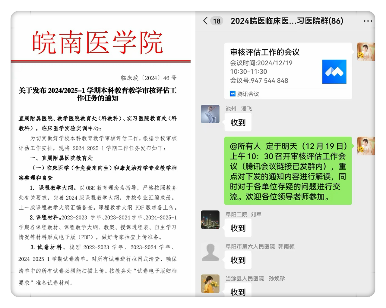 梳理指标,解读文件。根据学校任务清单,对直属附属医院、教学医院、实习医院和实验实训中心下发有针对性的任务清单,制作支撑材料目录和时间安排表,明确任务和倒排时间。12月19日,召开线上审核评估工作专题会议,教学(实习)医院相关负责人参加,陈祥攀结合任务清单和支撑材料目录对审核评估相关文件进行深入解读,帮助教学(实习)医院进一步厘清工作思路,明确目标和任务。