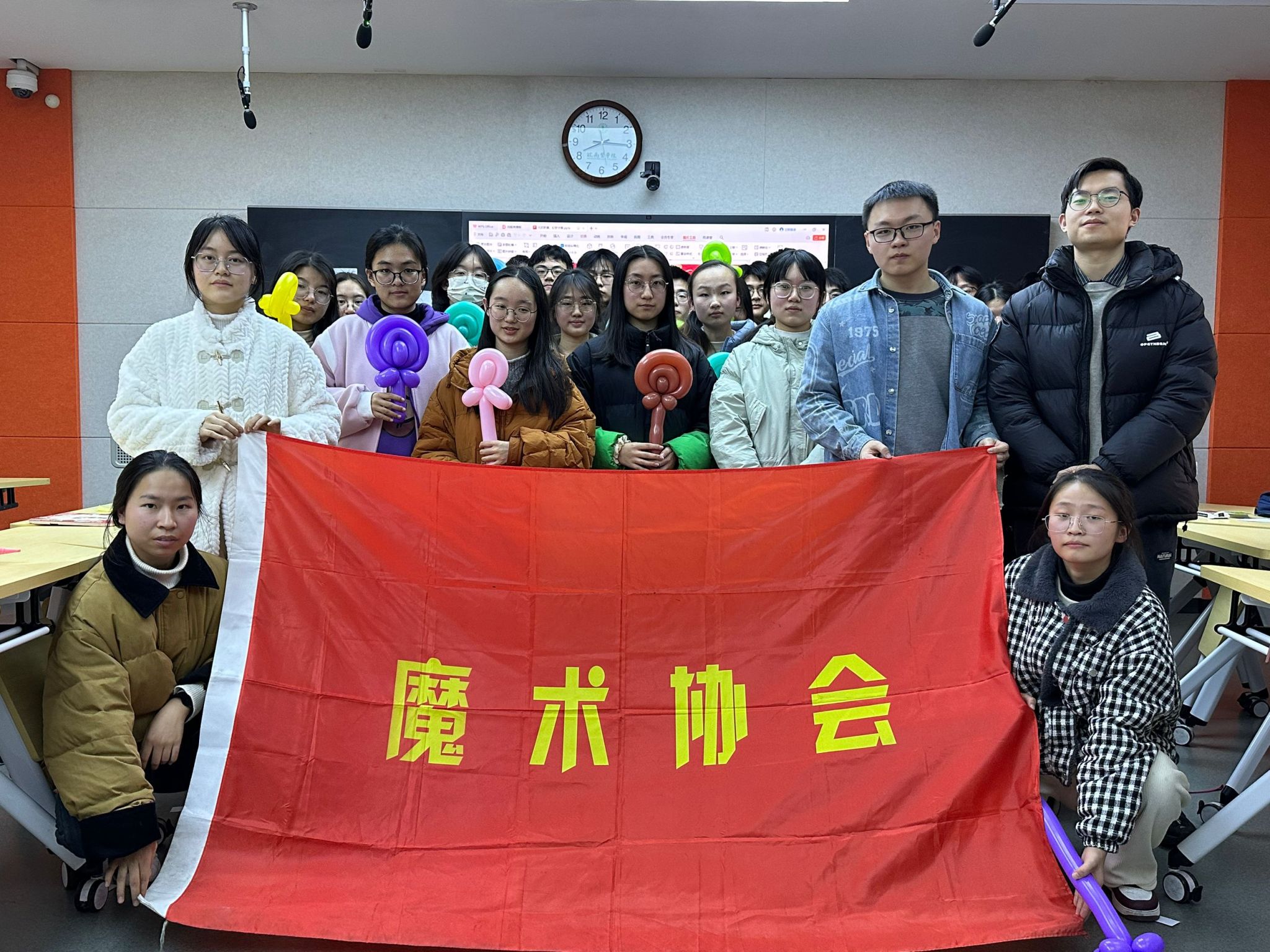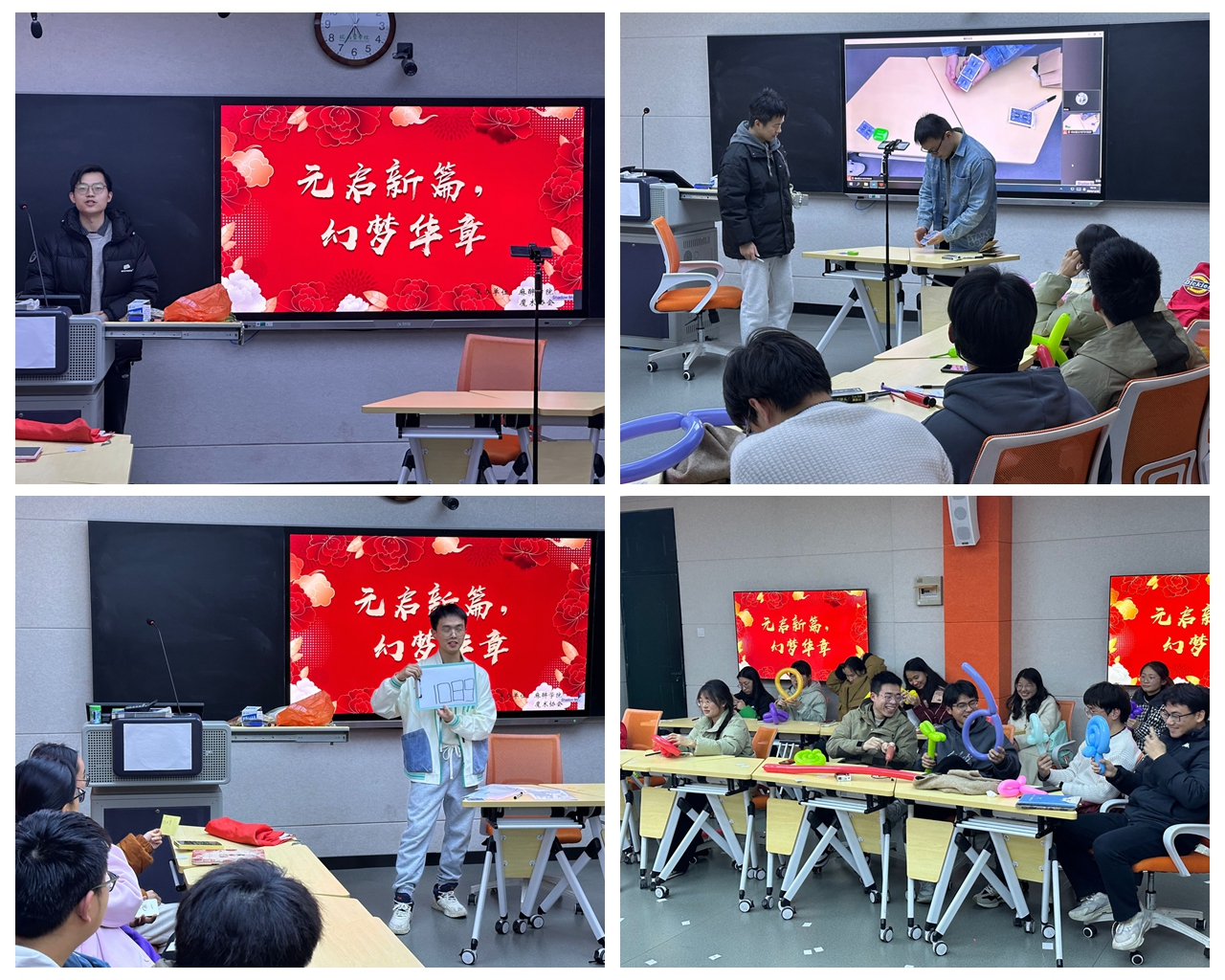 活动中,魔术协会成员们纷纷登台献艺。“薛定谔的信封”神秘莫测,激发着同学们的好奇心,大家都在猜测信封中隐藏的秘密;“皮筋穿越”更是奇妙无比,普通皮筋在魔术师手中如同有了魔力,做出违反常理的动作,引得同学们阵阵惊叹;而“心灵猜牌” 节目将气氛推向高潮,魔术师好似拥有读心能力,准确猜出同学们心中所想的数字和物品,随后还将这些元素巧妙组合成“幸福”二字,全场瞬间欢呼雀跃,掌声雷动。最后,气球社的成员们登场,带领同学们用气球编织花朵。在轻松愉快的氛围中,大家手中的气球逐渐变成了一朵朵栩栩如生的花朵,欢声笑语回荡在教室的每个角落。这场活动让同学们沉浸在节日的欢乐里,备考的紧张情绪得到有效缓解,考试信心也得以增强。同学们纷纷表示,这是一次难忘的体验,让他们在繁忙的学习生活中感受到了温暖和放松。