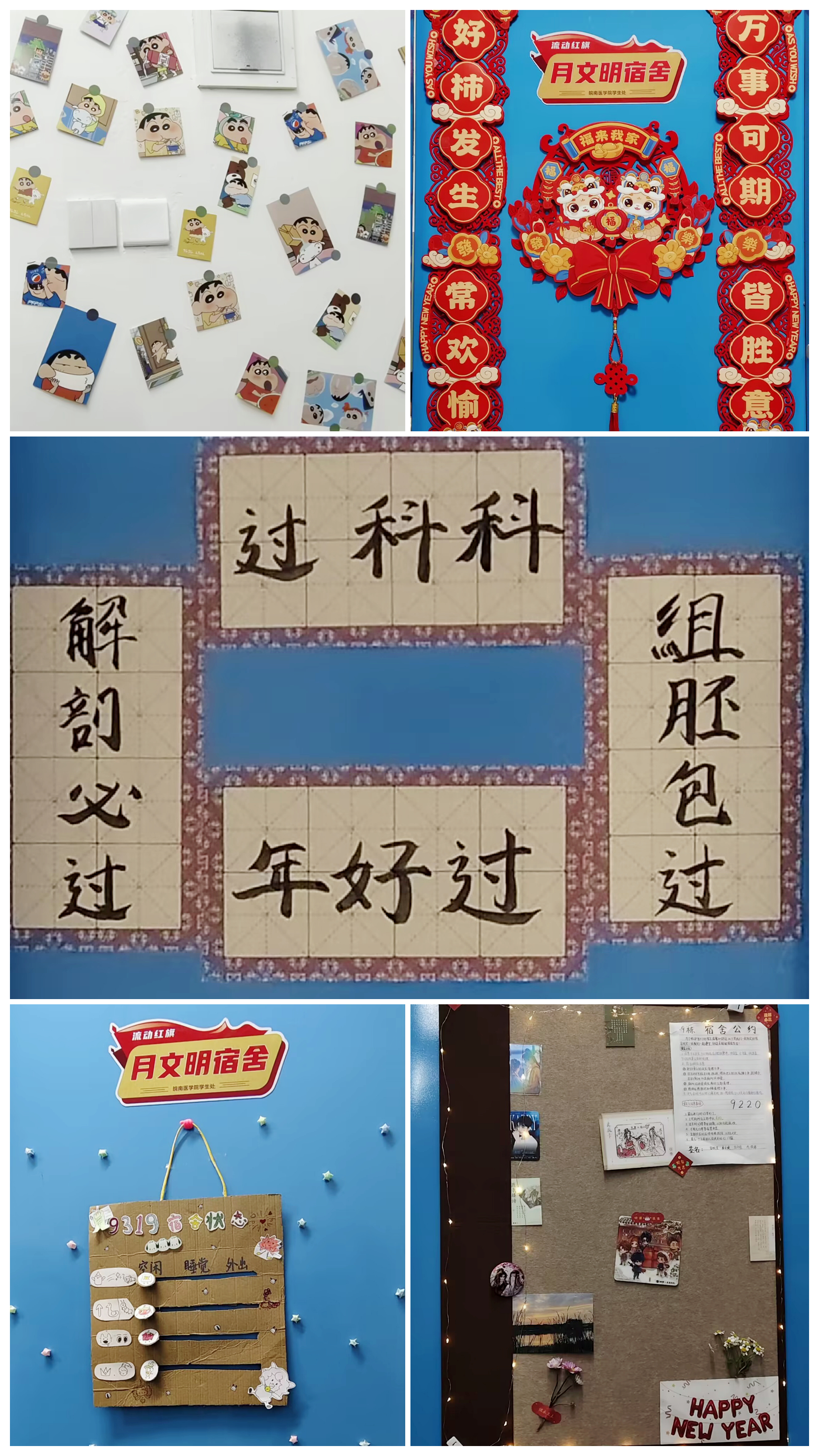雅室蕴温情,社区筑馨园。为营造温馨和谐、健康向上的宿舍文化,学院开展了“‘宿’说青春  ‘寓’见美好”寝室文化设计大赛。同学们发挥奇思妙想,利用彩带、贴纸、绿植等,将宿舍打造成一个个温馨舒适的小天地,不仅美化了居住环境,更增进了室友间的友谊。经过评委评选,最终评选出一、二、三等奖。