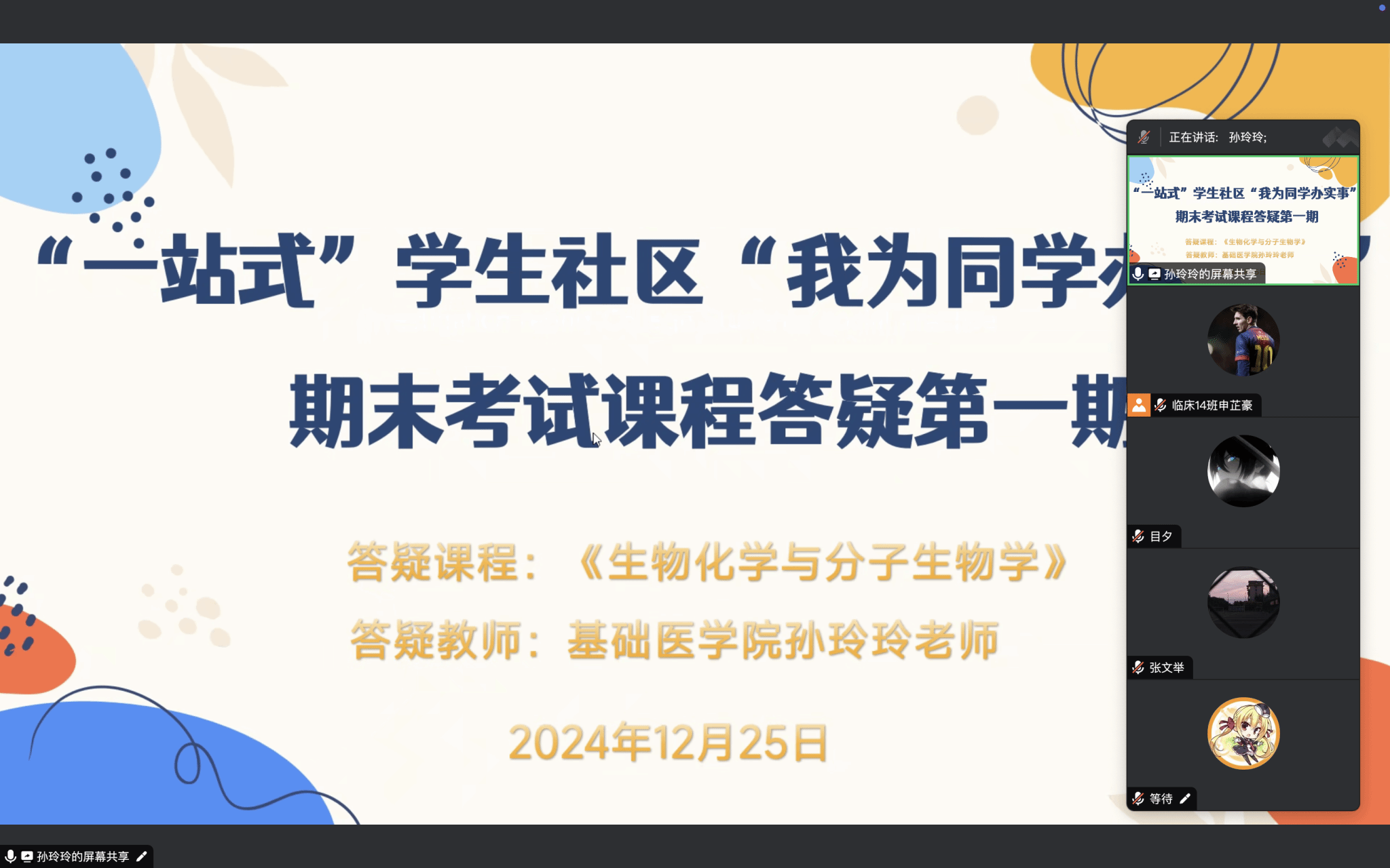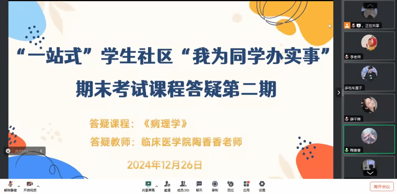 一站式答疑,精准化解学习难题。为帮助同学们解决在学习中遇到的难题,促进学习交流,提升复习效果,12月份以来,临床医学院“一站式”学生社区邀请临床医学院陶香香老师、基础医学院孙玲玲老师分别为学生进行《病理学》及《生物化学与分子生物学》课程线上答疑。活动期间,同学们纷纷抓住难得的机会,梳理学习中存在的疑难问题;老师们凭借深厚的教学功底和丰富的辅导经验,对同学们反馈的问题进行了详细透彻的解答,为同学们答疑解惑。通过搭建便捷高效的沟通平台,解决了学生在课程学习及备考过程中的实际困难。