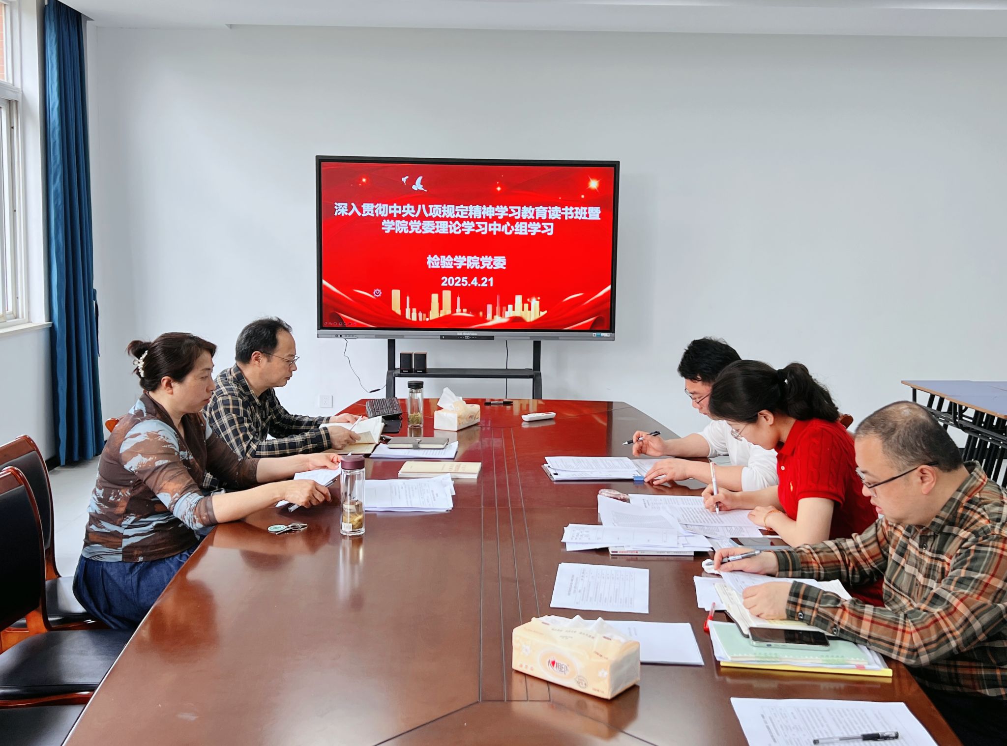 4月21日上午,检验学院党委开展深入贯彻中央八项规定精神学习教育专题读书班暨党委理论学习中心组(扩大)学习会。学院党委委员、各党支部书记参会。读书班由学院党委书记、副院长刘影主持。