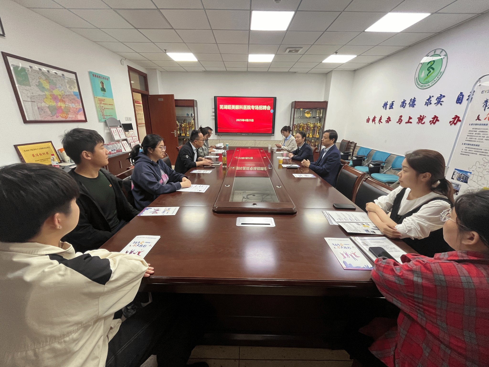 为搭建毕业生与用人单位的交流平台,拓宽学生就业渠道,4月25日,临床医学院邀请芜湖昭美眼科医院来院开展专场招聘会,学院党委书记方基勇、毕业班辅导员及秘书参加会议。