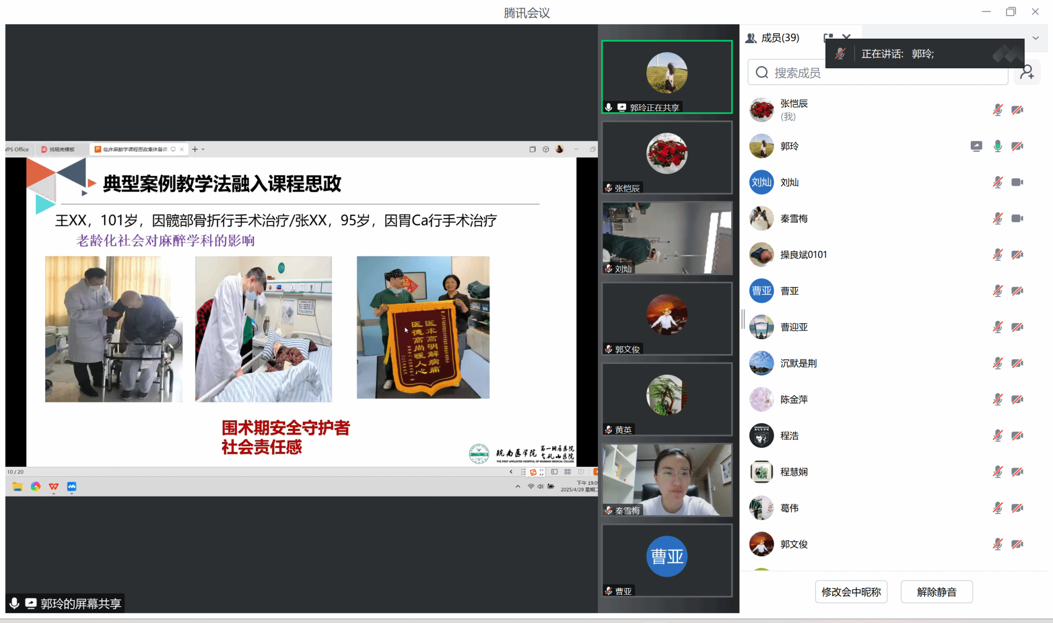 为深入贯彻落实立德树人根本任务,全面推进课程思政建设,深化专业课程与思政教育有机融合,4月29日晚,麻醉学院组织临床麻醉学教研室、重症医学教研室联合举办课程思政专项集体备课。本次活动邀请马克思主义学院黄英教授全程参与指导,学院院长郭文俊主持集体备课。