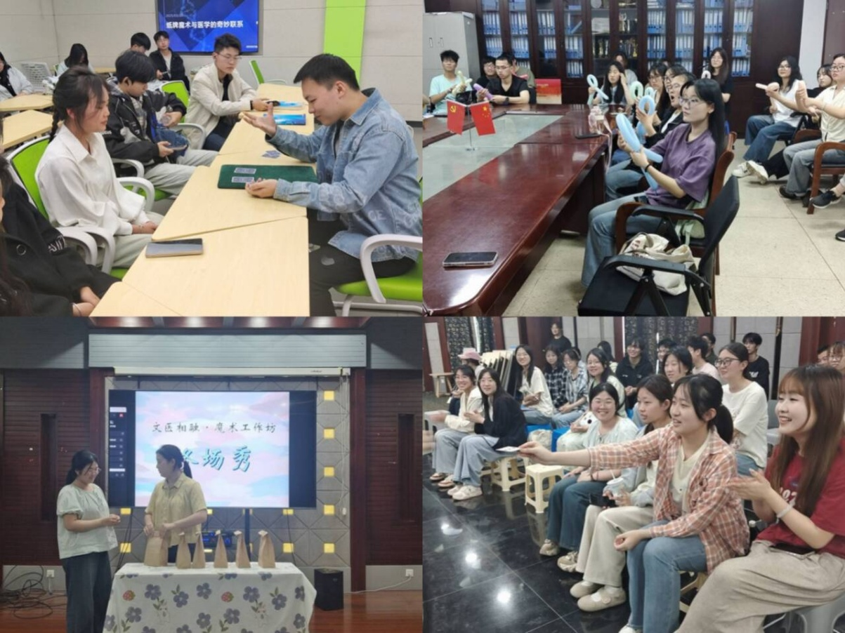 在学校学生社团精品活动项目支持下,麻醉学院指导魔术协会于3月至5月顺利开展了八期“文医相融・魔术工作坊”活动。活动以轻松有趣的形式将医学元素与魔术艺术创意相融合,吸引全校数百名学生参与,为校园文化生活增添了别样色彩。