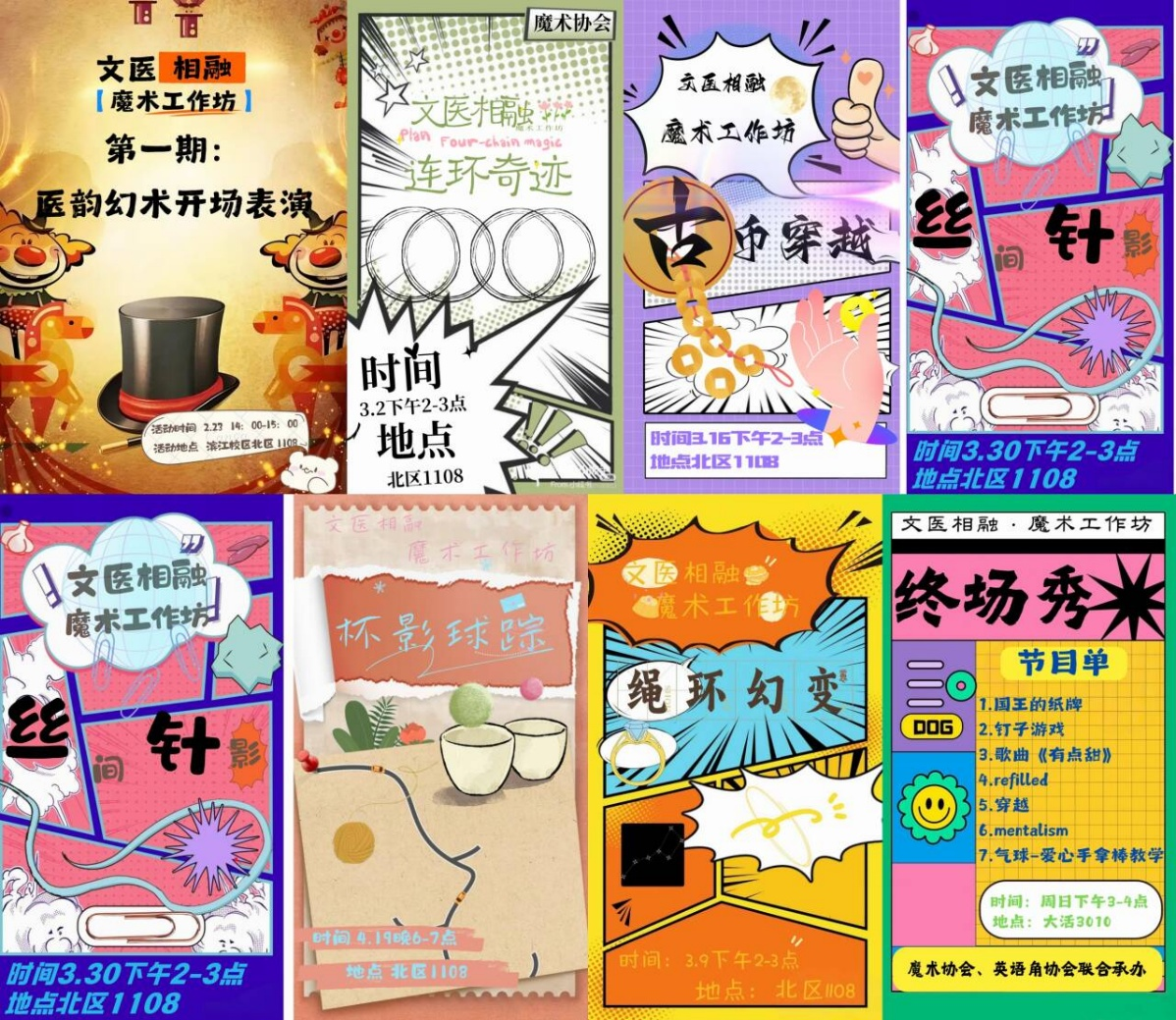 活动期间,协会每周举办一期魔术工作坊,围绕“医学生的跨界灵感”展开,巧妙地将医学知识融入魔术教学。“医韵幻术”表演以中医文化为灵感,魔术师借助草药、古钱币等元素演绎传统医学,让观众在奇幻效果中感受传统文化魅力;“绳环幻变”结合急救绳结知识,“杯影球踪”解析视觉暂留原理,“丝间针影”以针灸为灵感演示别针穿丝巾技巧,让同学们直观理解“魔术背后是科学”。同时,每期设置学员展演环节,50余名同学上台尝试“古币穿越”“扑克幻影”等魔术,在互动中提升表达能力。