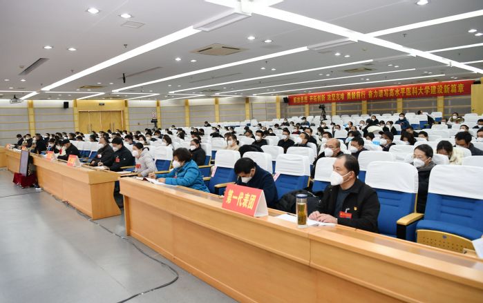 会议号召,让我们更加紧密地团结在以习近平同志为核心的党中央周围,高举习近平新时代中国特色社会主义思想伟大旗帜,以永不懈怠的精神状态和一往无前的奋斗姿态,奋力谱写高水平医科大学建设新篇章!