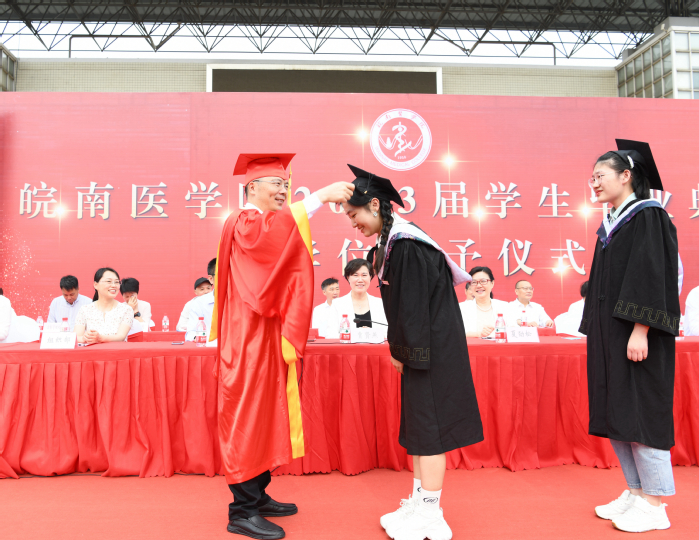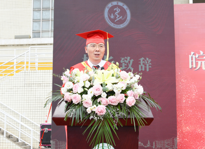 姚应水发表了饱含深情、富有哲理的讲话。他代表学校向圆满完成学业的全体毕业生表示最诚挚的祝贺,充分肯定了同学们在学业上努力探索,在抗疫中坚韧勇敢,与学校共同成长的奋进征程,为以实际行动传承皖医校训的同学们感到自豪。姚应水对毕业生们提出三点希冀:一是以梦为马,坚毅笃行。厚植家国情怀,心怀“国之大者”,把对祖国血浓于水、与人民同呼吸共命运的情感贯穿学业全过程;勇于追求个人梦想,找到个人梦想与中国梦的结合点,脚踏实地,埋头苦干。二是以学为器,强国担当。树立终身学习的意识,增强终身学习的能力,从书本中涵养浩然之气,树立崇高理想,在实践中强化专业知识,练就过硬本领,从前辈中汲取优秀品质,潜心建功立业,为全面建设社会主义现代化国家、全面推进中华民族伟大复兴作出新贡献。三是以美为媒,闪耀生命。善于发现美,仰观宇宙之大,俯察品类之盛;善于创造美,热爱生活、热爱自己,永葆赤子之心,让生命闪耀青春之光。