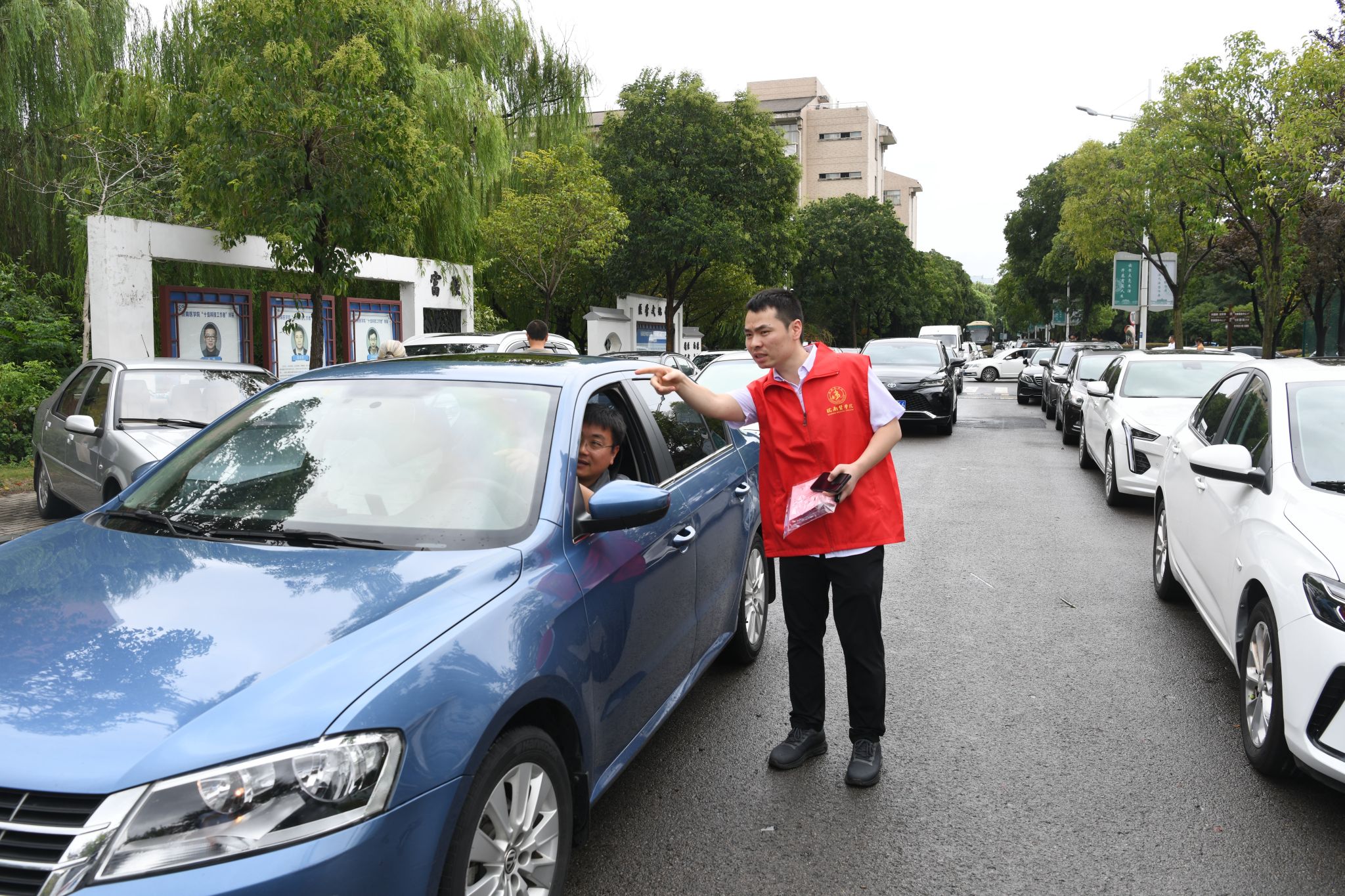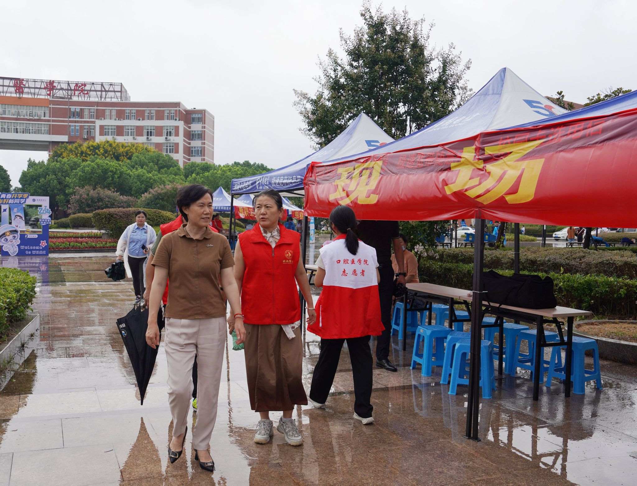 全心全意迎新生,全力以赴办实事。在迎新现场,还有一支由师生党员组成的志愿服务队。他们统一佩戴党徽,亮出党员身份,用心用情用力投身迎新工作中,开展交通疏导、防诈防推销宣传、新生引导咨询、行李搬运等工作任务。尤其迎新首日,由于校门口市政道路维修、校内停车空间有限,为避免自驾车辆拥堵,保证交通通畅,由教师党员组成的党员先锋队早早到达指定位置,配合保卫处耐心引导新生报到自驾车辆有序进校、安全停放、下卸行李、定向驶离。虽然穿着雨衣,但雨水和汗水却早已浸湿了他们的衣背。据统计,迎新期间,全校共设立党员服务站16个,成立党员服务队16个,有近600名师生党员参与迎新工作中,他们以实际行动擦亮了党员底色,让党旗在迎新一线高高飘扬,让党徽在迎新一线闪闪发光。