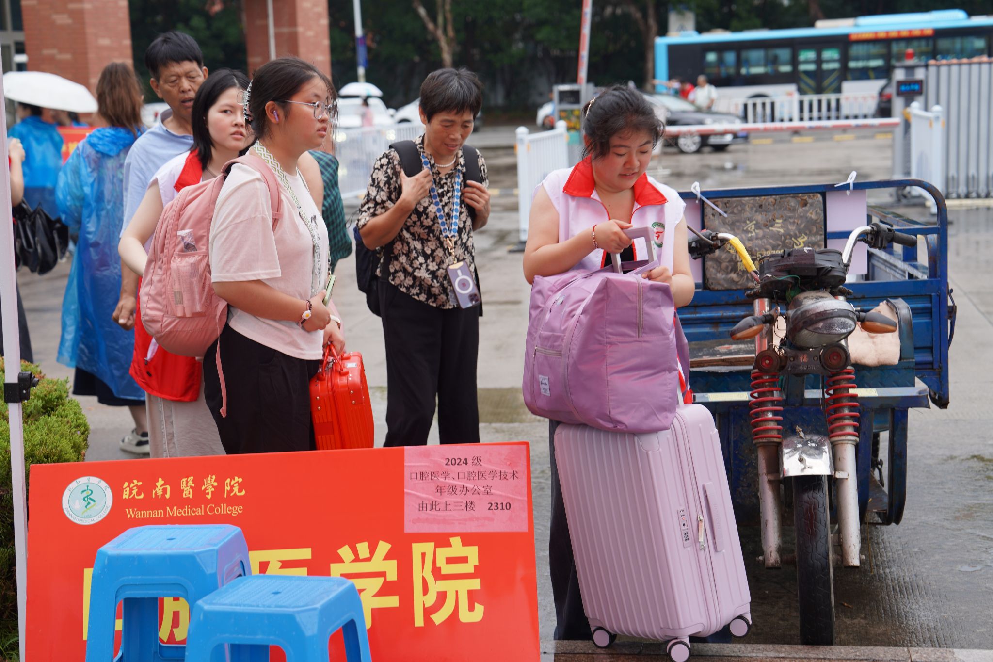 报到期间,校园内处处可见志愿者忙碌的身影。不管是雨中身披雨衣,还是雨后顶着烈日,都没有影响到志愿者炽热的心。他们“点对点、人对人”帮助新生搬运行李、讲解报到流程、介绍校园环境、办理报到手续和入学身份核查……积极为新生提供“一站式”服务。同时,学校还组织志愿者前往芜湖市火车站和汽车站迎接新生,为新生提供全程无忧贴心服务。一句句亲切的问候,一项项贴心的服务,构成了学校一道道亮丽的风景线,志愿者们用暖心的服务传递着学校的关爱,让每一位新生感受到如家般的温暖。