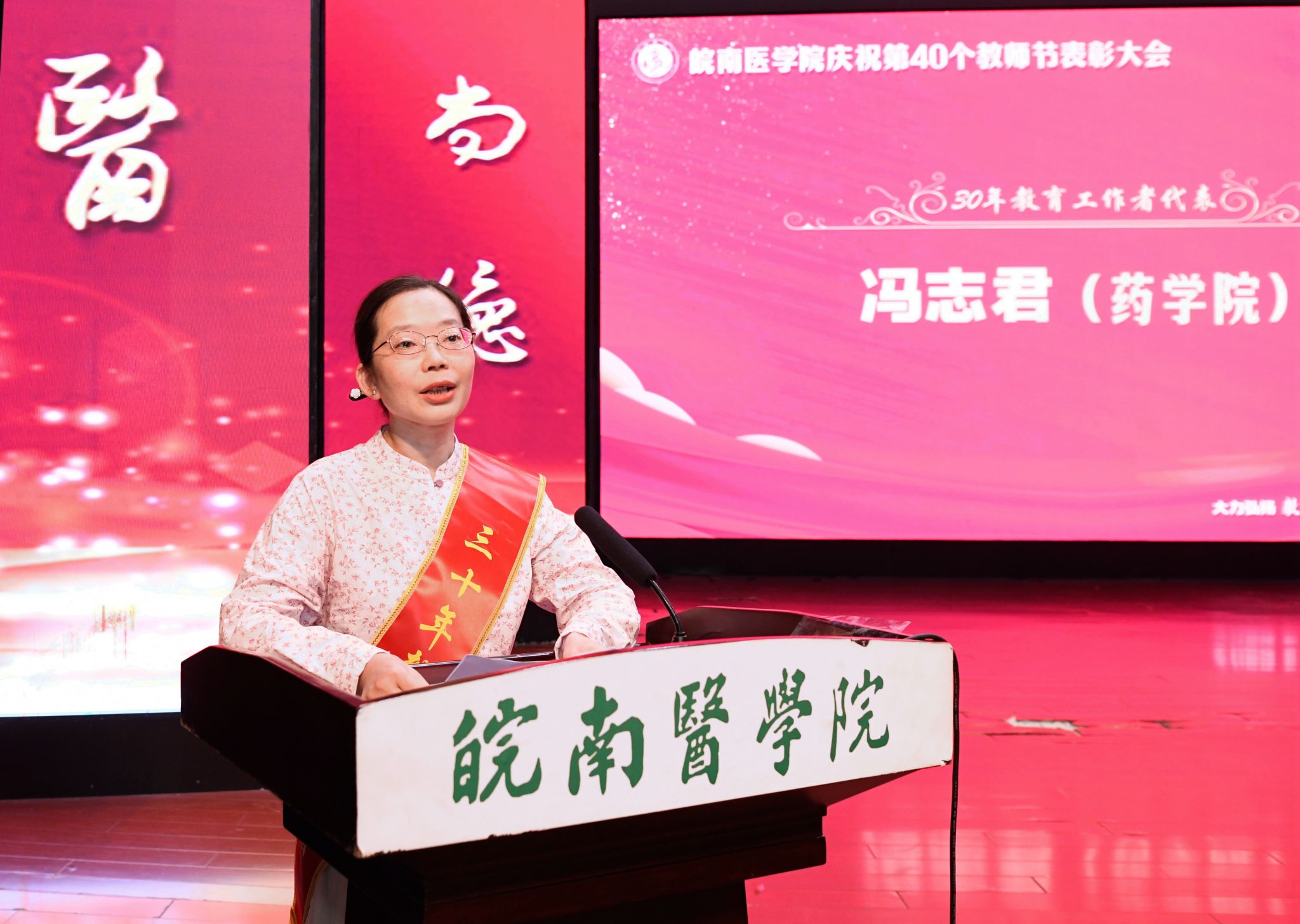 校领导为先进集体代表、优秀教师、优秀教育工作者、其他优秀个人和30年教育工作者颁奖。先进集体代表、基础医学院党委书记马旭明和优秀教师代表曹亚、30年教育工作者代表冯志君分别发言。