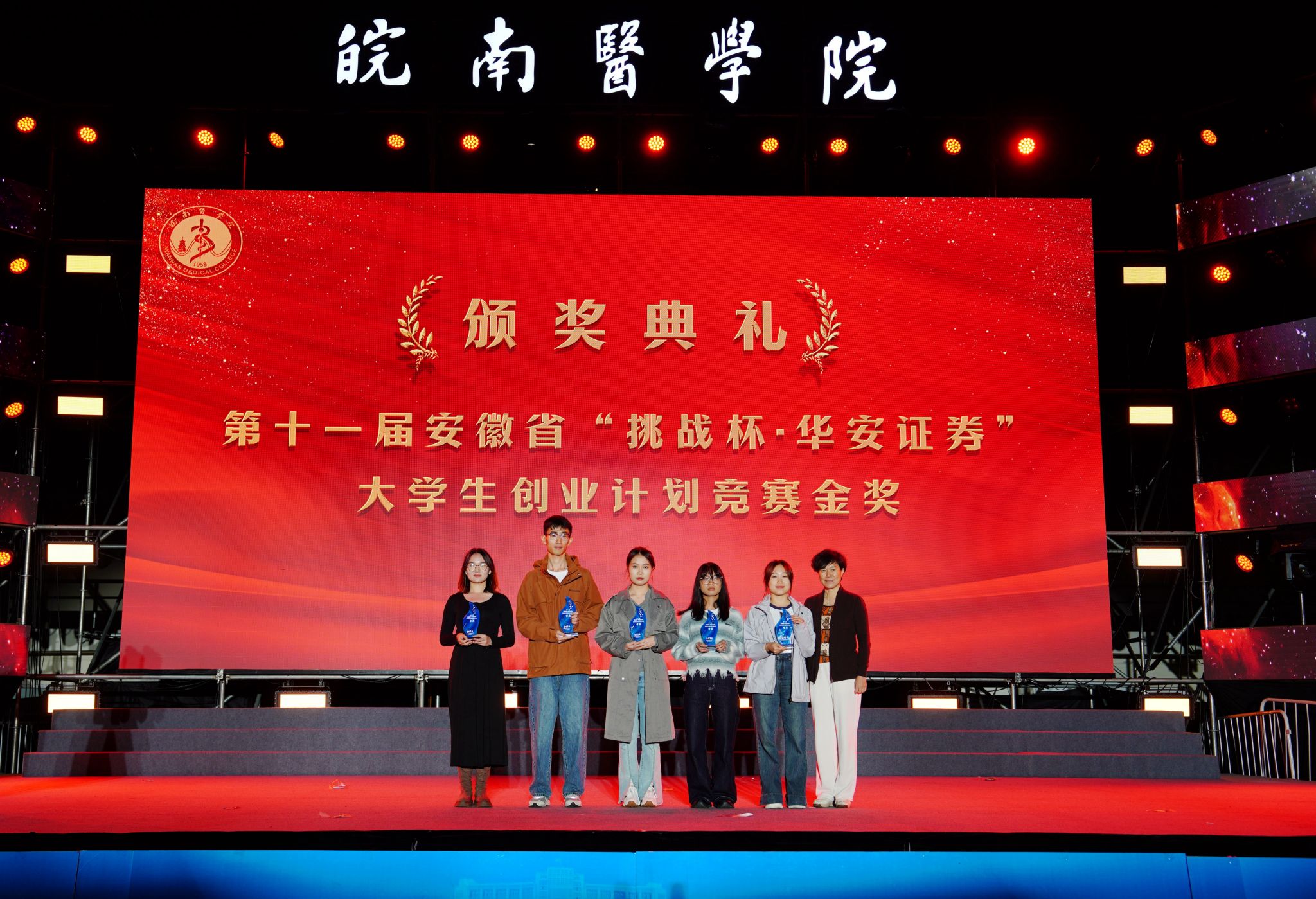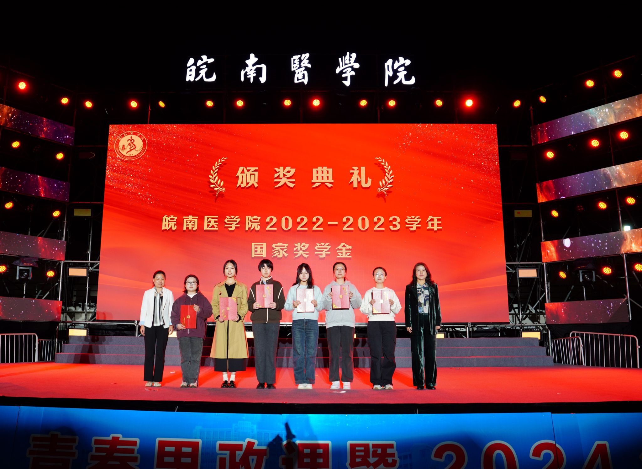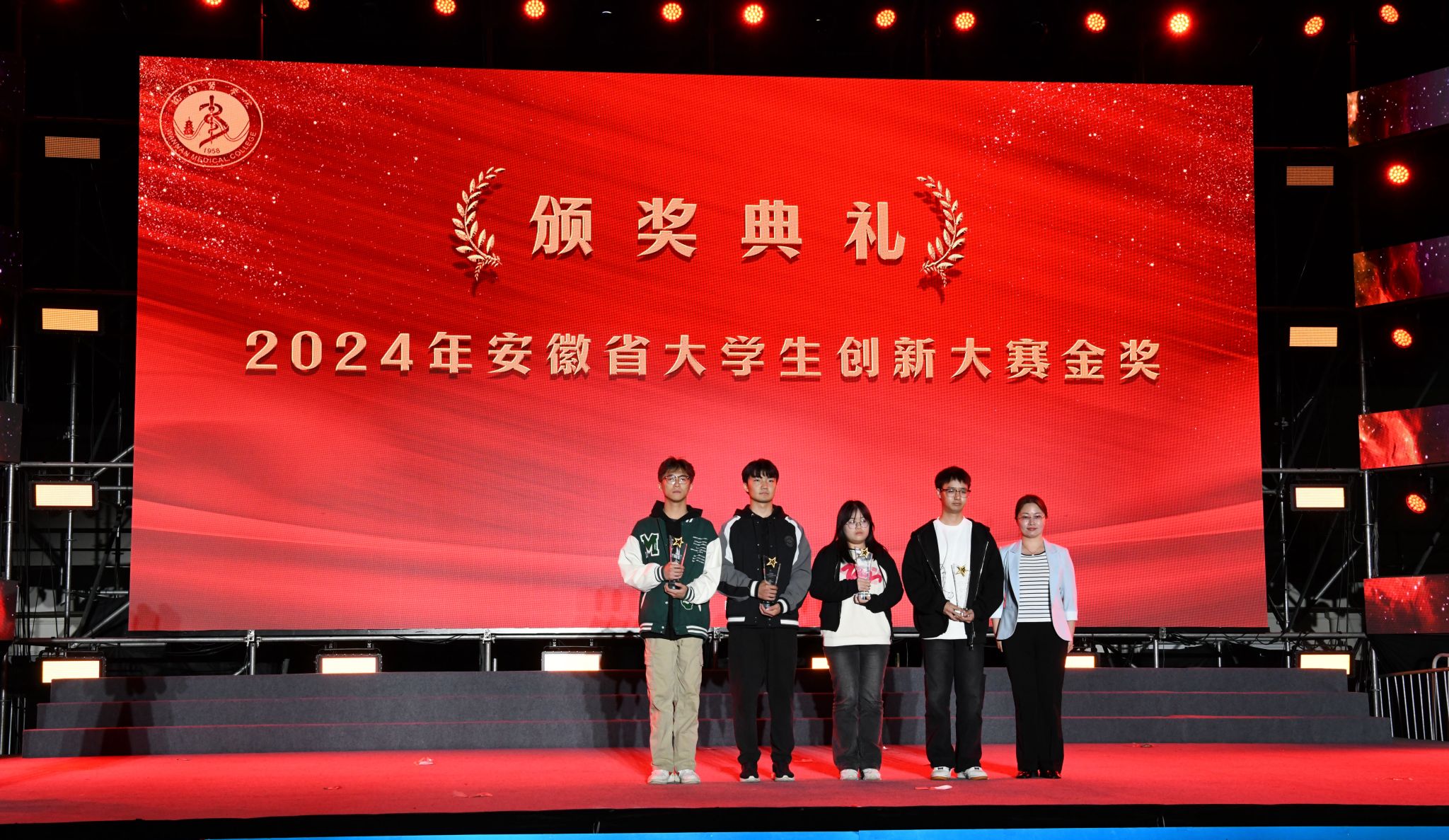 在随后的颁奖典礼中,夏劲松、姚应水、贾贤燕等为我校获得2022-2023学年国家奖学金,安徽省大学生创新大赛(2024)金奖项目、第十一届省“挑战杯”大学生创业计划竞赛金奖项目和第十七届安徽省大学生职业规划大赛一等奖项目,2024年度校“十佳大学生”等青年优秀典型颁奖。通过盛大隆重的仪式感教育,充分发挥朋辈榜样示范的育人作用,激励着广大学子向先进看齐,与标杆比肩,争做民族精神、时代精神和皖医精神的传承者与践行者,在助力学校高质量发展的奋斗中,用智慧和力量书写闪亮的青春答卷。