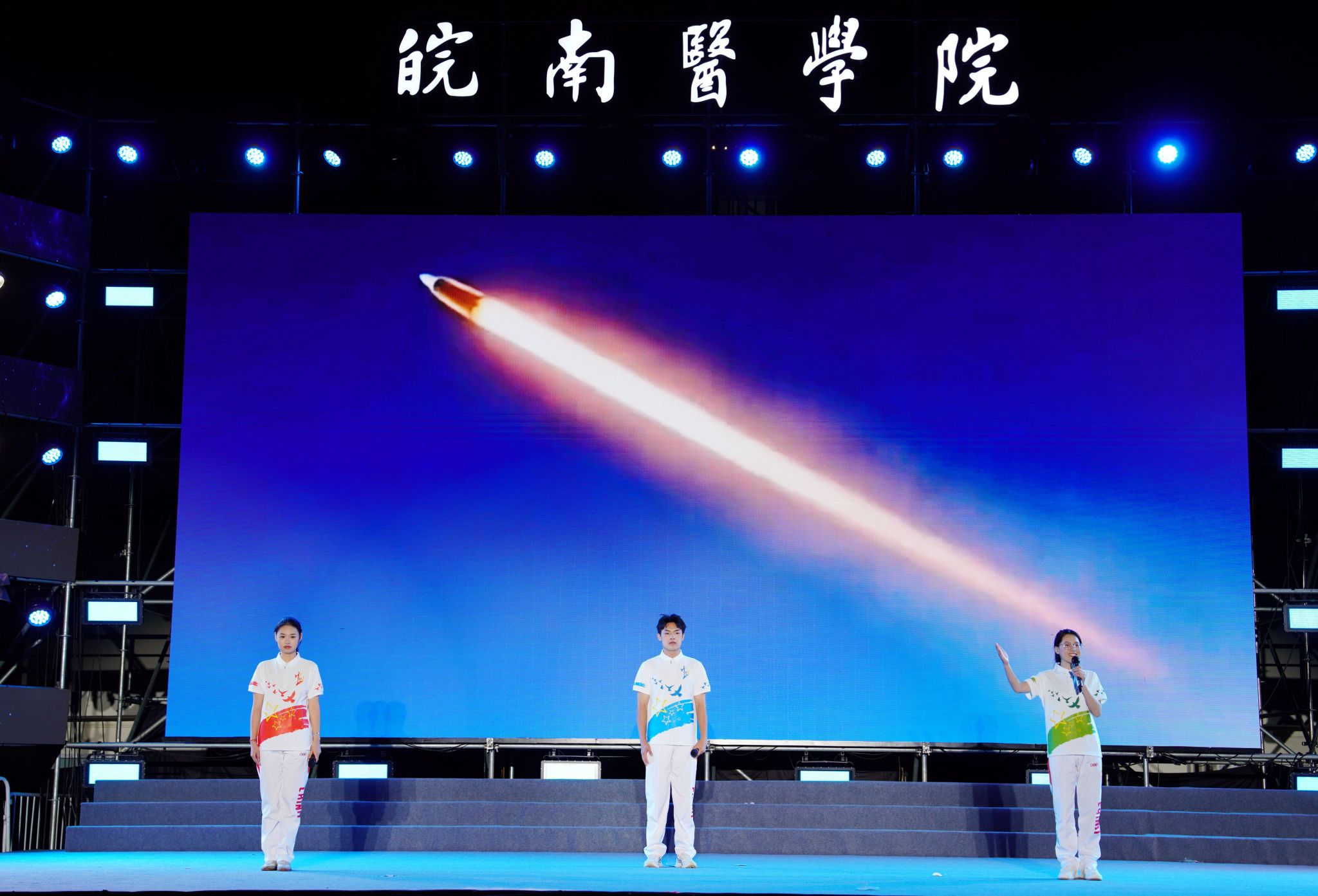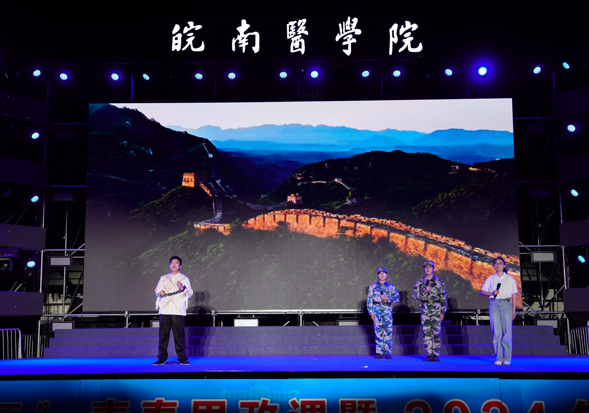 由新生辅导员和学生带来的相声《你好,新一代的皖医人》妙语连珠、金句频出,展现了皖医当下凝心聚力、守正创新的开放发展,既风趣幽默,更振奋人心;踏着欢快节拍、活力起舞的2024级新生们通过舞蹈《像你这样的朋友》展现了皖医“新”上人满怀梦想、朝气蓬勃的青春形象,改编的歌词朗朗上口,唱出了当代皖医人不忘初心、献身医学的坚定信念和精医尚德、求实自强的铿锵誓言;音诗画《可爱的中国》将晚会推向了最高潮,情景朗诵追忆了新中国七十五载的栉风沐雨,歌颂了七十五载的春华秋实,大气恢宏、美轮美奂的舞蹈是“盛世中华正奔腾”的生动写照,34声铿锵有力的答到声是青年人对祖国的深情告白;朗诵《这盛世,如您所愿》以“野马”“威龙”“东风”三个角色的故事为主线,从开国大典上“飞机不够,我们就飞两遍”,到歼-20战机编队遨游祖国蓝天,再到洲际导弹“东风快递,使命必达”的成功发射,再现了我国从站起来、富起来到强起来的盛世景象;晚会在大合唱《如愿》中圆满落幕,响彻皖医夜空的嘹亮歌声表达了我校青年师生青春有为、挺膺担当的拳拳赤子之心。