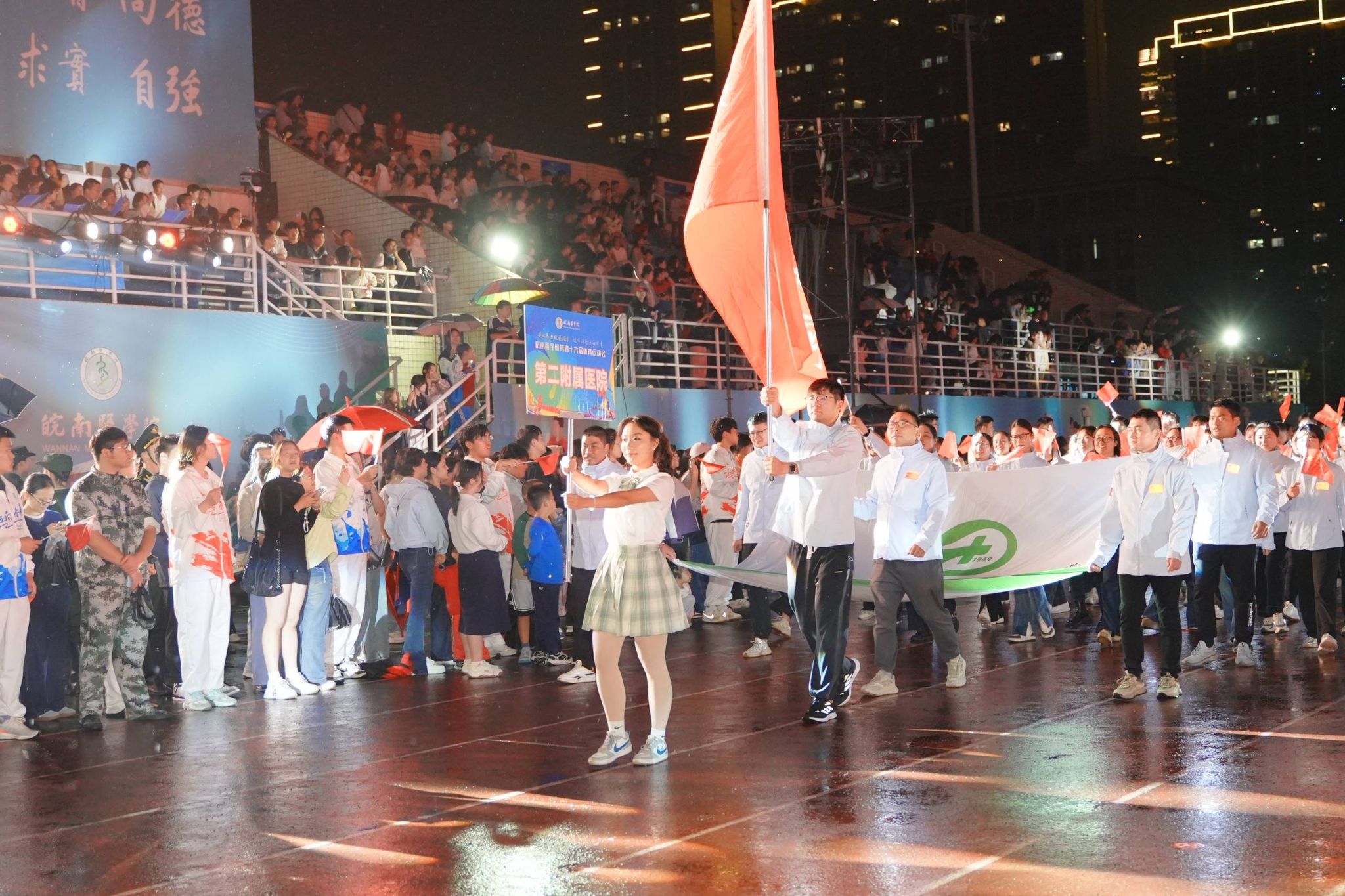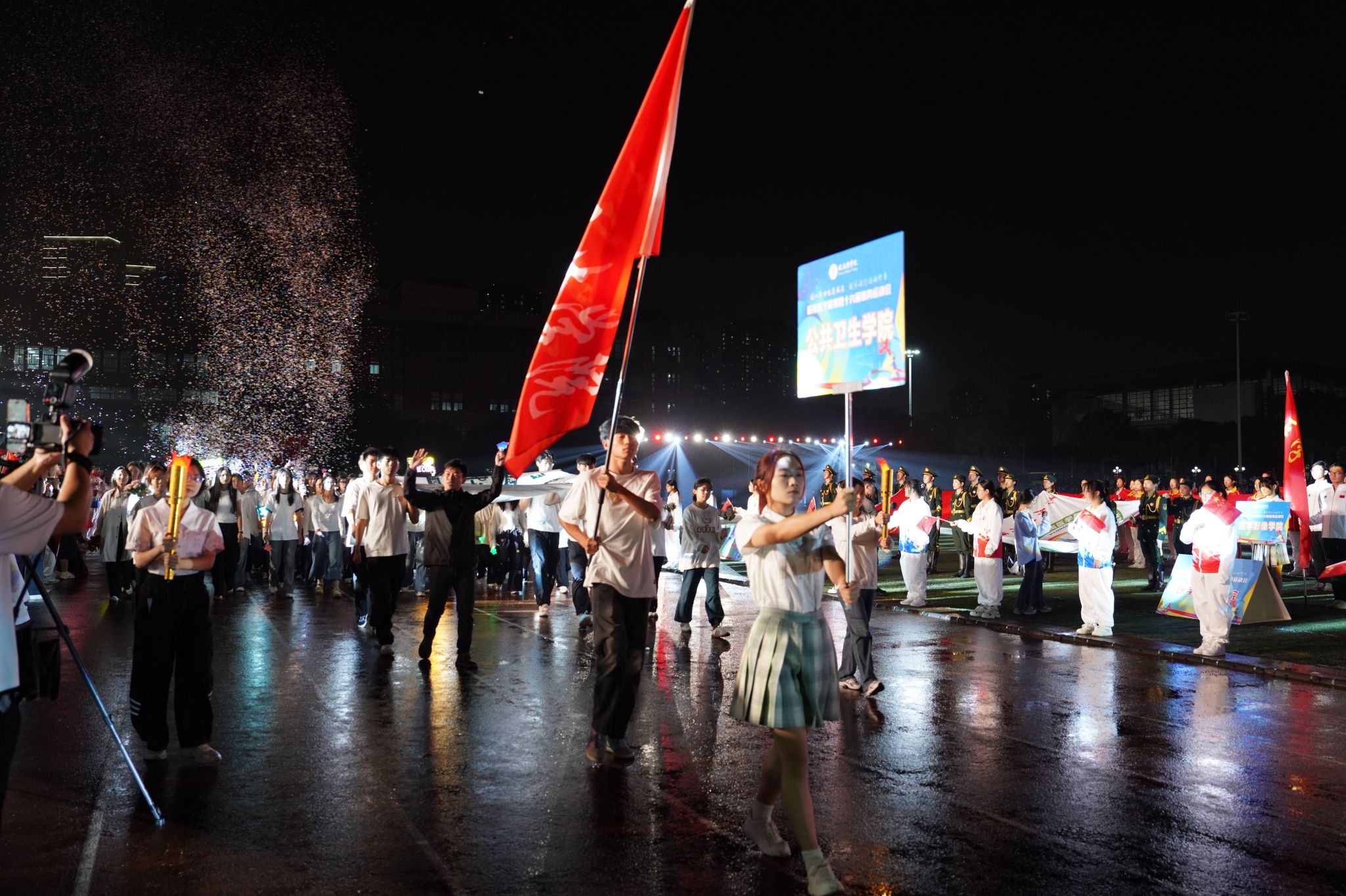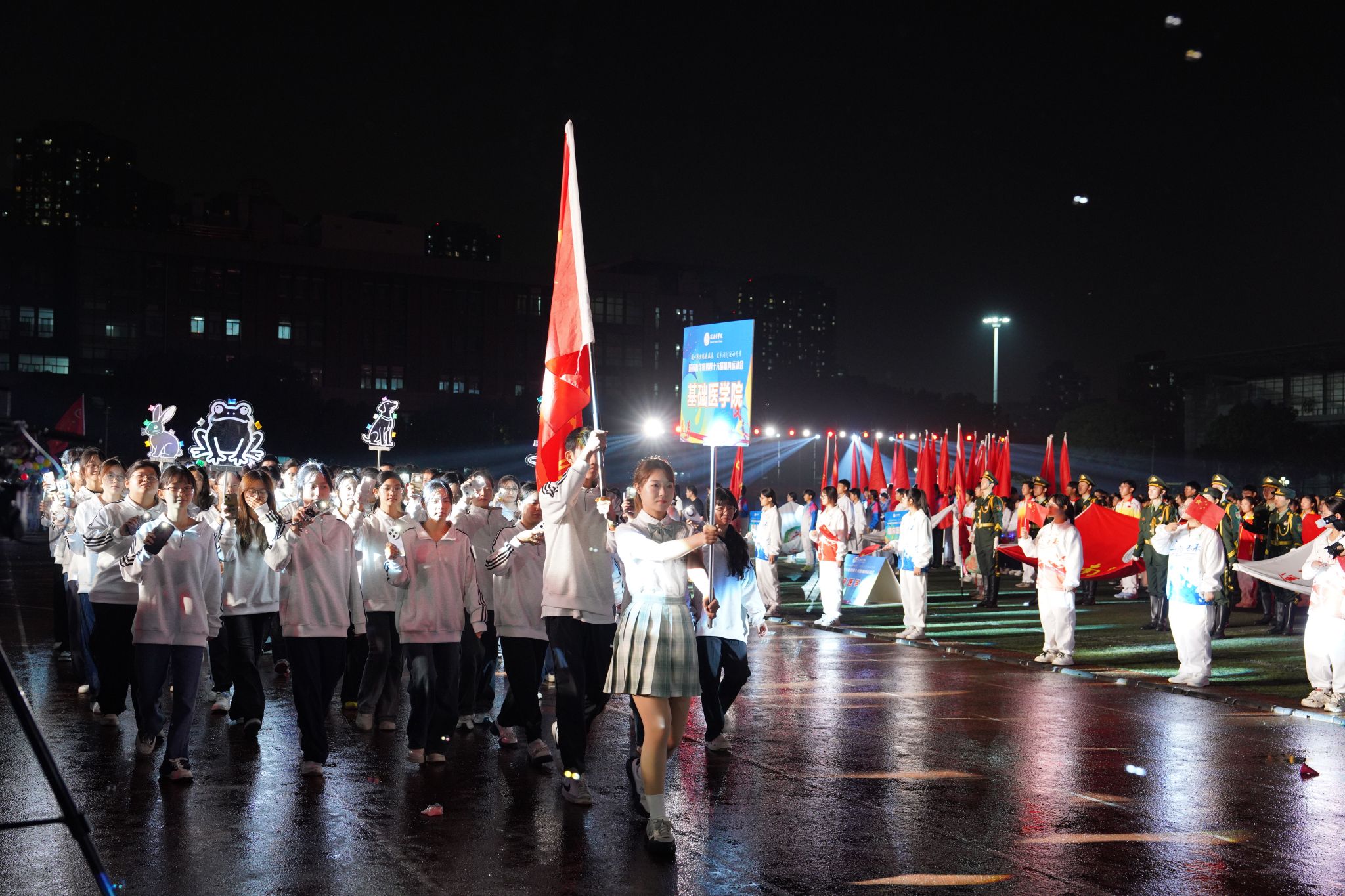 伴随着璀璨绚丽的灯光、欢快动感的旋律,精彩纷呈、声势浩大的文艺汇演让现场师生共同感受了一场力量与美感交融、青春与活力交织的视觉盛宴。此次文艺汇演分为“同心同行”“活力绽放”“共赴新程”三个篇章。鼓声激荡,直冲云霄;旗影翻飞,撼动乾坤,气势磅礴的舞蹈《旗鼓飞扬》拉开第一篇章的序幕,瞬间点燃了现场气氛。《龙狮跃鱼灯》将龙狮的磅礴威仪与鱼灯的灵动飘逸熔于一炉,把非遗传承与青春力量完美融合;主席台领导现场执笔为祥狮进行点睛,共同送上寓意深远的美好祝福。《舞动炫彩》通过彩带的灵动变幻,绽放出一朵朵绚烂的“太阳花”,展现出医学生用仁心守护每一个生命的绚烂绽放。第二篇章“活力绽放”中,《花样青春》通过“花”的生长脉络,生动勾勒大学生从青涩到成熟的成长历程,唱响“青春绽放、时代同行”的主旋律。《青春耀华夏》用“团体操+表演”的形式,结合纪念中国人民抗日战争暨世界反法西斯战争胜利80周年,激励青年学子铭记过往历史、传承红色基因。匕首操军体拳表演《利刃凌云》,将大学生的青春朝气与军人的铁血精神相融,一招一式尽显果敢与坚毅。第三篇章“共赴新程”,彰显了青年学子的爱国之情和对未来的美好祝愿。舞蹈《美丽中国》伞影婆娑,200余名学子通过伞的变化和组合拼出“我爱中国”,赤子之心跃然眼前;《旗开得胜》以旗为笔、以天地为画卷,勾勒出“旗如云、舞如风”的壮阔景象,传递着“旗开得胜”的美好寓意。《民族同心家国同辉》将56个民族的舞蹈元素与家国情怀深度融合,展现出各民族像石榴籽一样紧紧相拥的团结之美。此外,离退休老同志带来健身舞《花开中国》, 表达了老同志对祖国的无限深情和对美好生活的热爱。