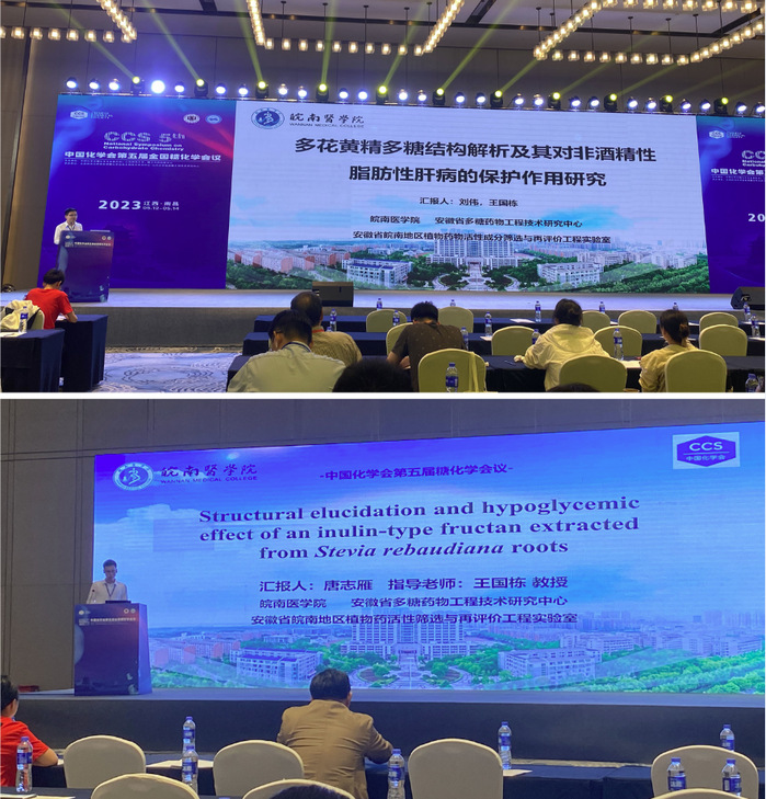 我校安徽省多糖药物工程技术研究中心常务副主任王国栋教授带队参加了会议,并通过口头报告、墙报等多种交流形式,向与会专家汇报了多糖药物研发团队最新科研进展和成果。其中,我校研究生刘伟作了题为“多花黄精多糖结构解析及其对非酒精性脂肪肝病的保护作用研究”的报告,介绍了多糖药物研究团队关于“十大皖药”九华黄精活性多糖的筛选、结构解析及其对非酒精脂肪肝病的保护作用相关研究成果;研究生唐志雁作了题为“Structural elucidation and hypoglycemic effect ofan inulin-type fructan extracted from Stevia rebaudiana roots”的报告,介绍了团队对于甜叶菊根多糖的结构解析及其降血糖活性的研究相关成果,引起了与会专家的广泛兴趣,以上两个报告相关内容近期均以论文形式发表在中科院一区Top期刊Food & Function上,并申请发明专利各一项。