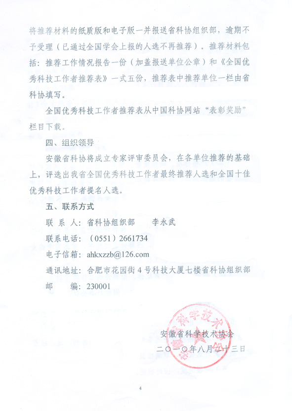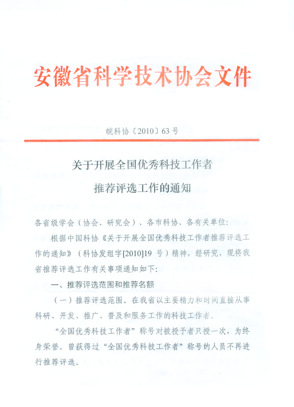 接安徽省科协《关于推荐全国优秀科技工作者候选人的通知》(皖科协[2010]63号),我校可推荐1名全国优秀科技工作者候选人。请有意者于2010年9月6日以前将推荐材料经所在部门同意后,将纸质版和电子版报送我校科研处,逾期不报视为自动放弃。申报要求及推荐表格见附件。。