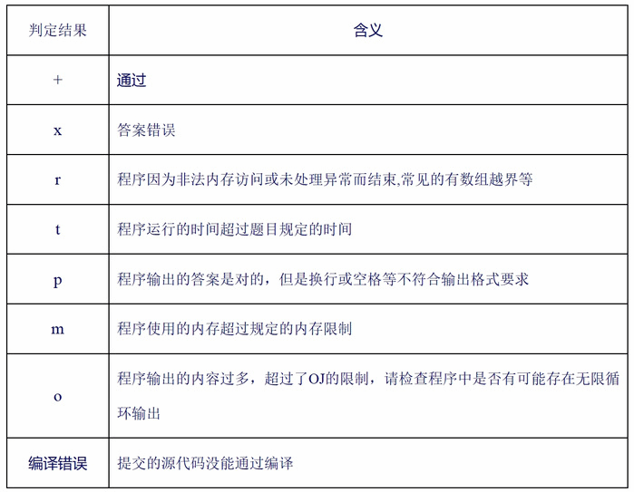 竞赛采用现场赛形式。竞赛进行中,每个参赛队拥有一台计算机,每一道题均采用程序求解,参赛队通过比赛系统在线提交源代码,后台服务器通过测试数据进行程序正确性判断,每个测试点的判定结果实时反馈给参赛队伍,系统反馈的判定结果及其含义如下所示。