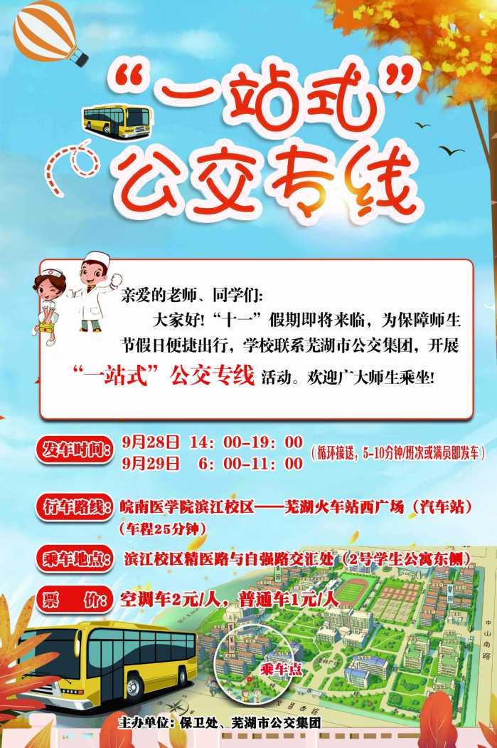 为持续巩固深化学习贯彻习近平新时代中国特色社会主义思想主题教育成果,扎实开展“我为群众办实事”实践活动,推进“幸福皖医行动”,学校经与芜湖市公交集团联系,将在“十一”假日期间开展“一站式”公交专线乘车服务活动,保障师生节假日便捷出行。现将有关事项通知如下: